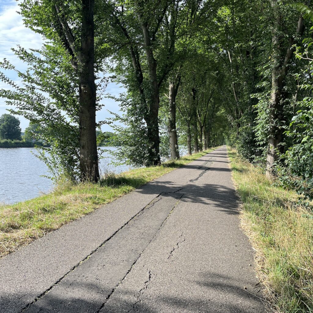Om 8 uur fiets ik weg bij Mayke en om iets over tienen zit ik aan de koffie in Breukelen, ongeveer een derde zit er op naar de bestemming van vandaag. Ik rij langs de Weespertrekvaart en vervolgens het Amsterdam-Rijnkanaal, dat klinkt misschien saai, maar dat is het niet. Er vaart van alles in het water en je fietst het eerste stuk lekker onder de bomen. Bovendien is het bijna windstil, dus ik schiet lekker op en mijn aanval van zwakte is ongemerkt voorbij gegaan.