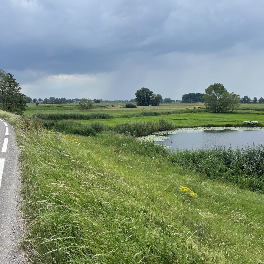 In Vianen bestel ik kroketten met bruin brood, eentje is hol en het bruine brood zijn twee plakjes van een AH-knip bruin. Enfin, ze leveren wel de nodige calorieën. Even later begint de hemel te betrekken en het begint serieus te waaien. Dan weet je dat er buien in de buurt zijn. Het ontspannen peddelen verandert in stevig trappen tegen de wind in , want de buien zitten achter mij. Heel lang denk ik dat ik het droog hou, maar na het veer van Brakel wordt het opeens heel koud en barst de bui toch los. Gelukkig is het na een half uur weer droog.