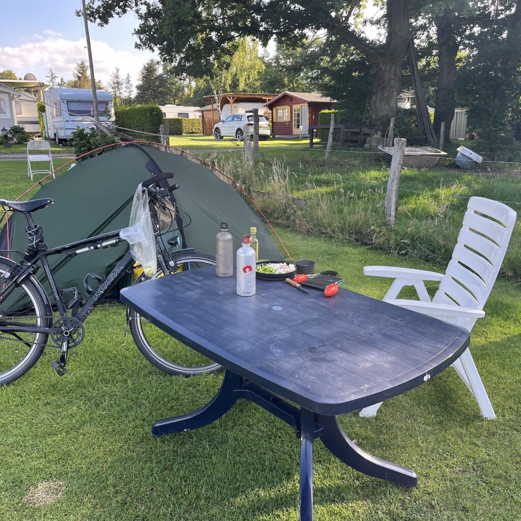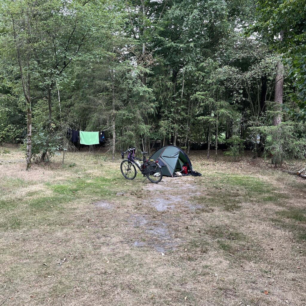 Als we terugkomen is de toegang tot onze plek versperd door een camper met voortent. We moeten met de fietsen door de voortent om bij ons plekje te komen. Te voet kunnen we ook wel door de struiken naar het toiletgebouw, maar hoe we dit morgenochtend vroeg gaan oplossen?