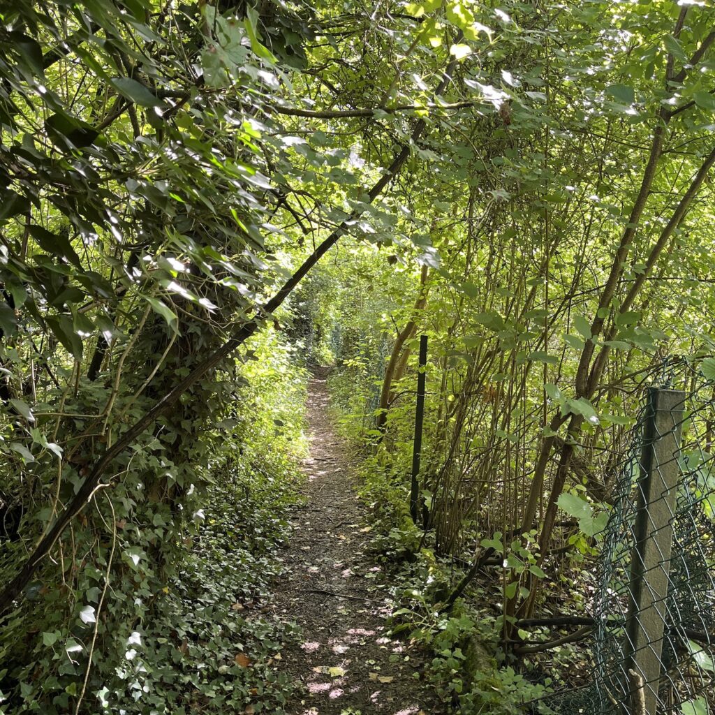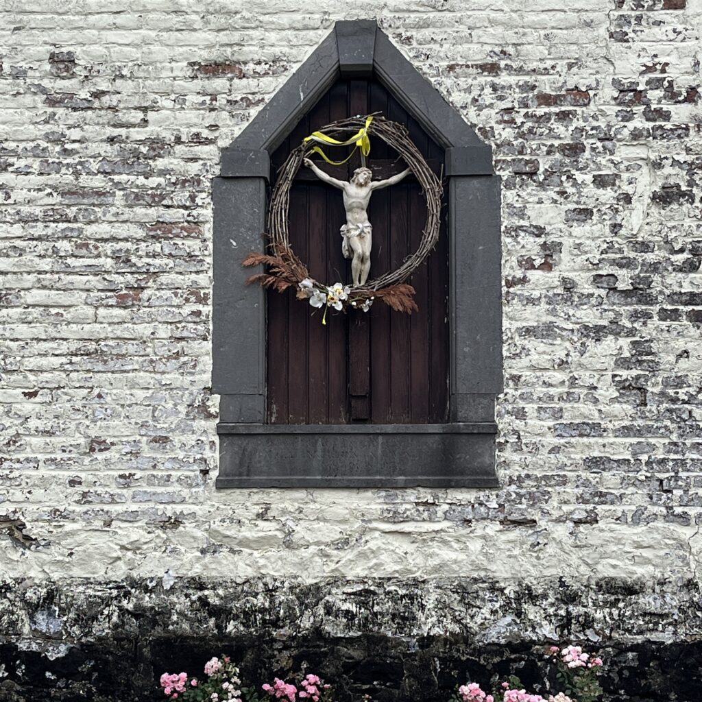 Als ik tegen achten vertrek, zit andere Frans nog aan zijn ontbijt. We zien elkaar vermoedelijk nog wel een keer. De route bestaat nu uit telkens korte steile klimmetjes en dan weer afdalingen, het fijne van het nieuwe verzet is dat ik geen enkele keer hoef af te stappen. In Epen drink ik koffie, ik was hier een kleine dertig jaar geleden met mijn collega’s van de afdeling Collectie van het Nederlands Architectuurinstituut. We gingen af en toe een weekend met elkaar op stap en dit keer wandelden we rond Epen. We sliepen in een heel belabberd hotelletje met doorgezakte bedden, de vegetariërs kregen die avond pasta met een blik champignons erdoor te eten. Jammer genoeg weet ik niet meer welk hotel dat was, anders was ik daar beslist even gaan kijken.
