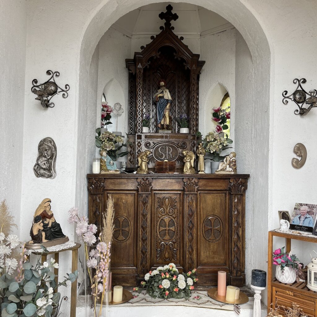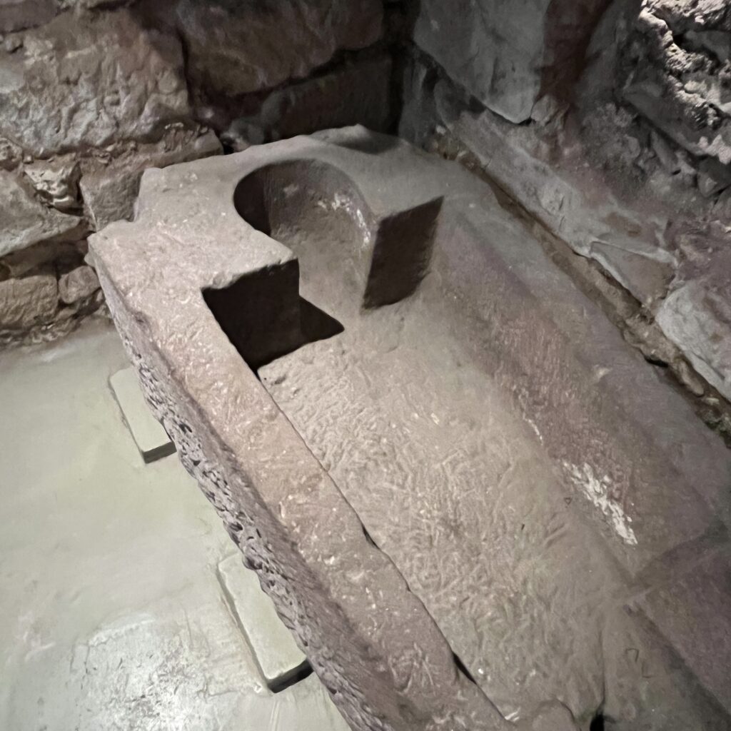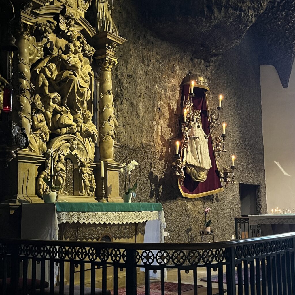 Van de grote kerk loop je door hele lange gangen naar de grotkapel