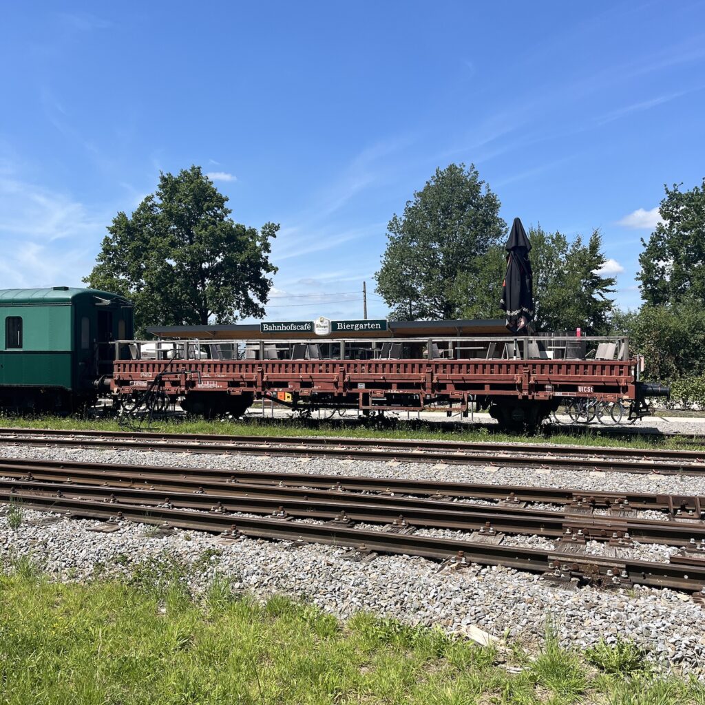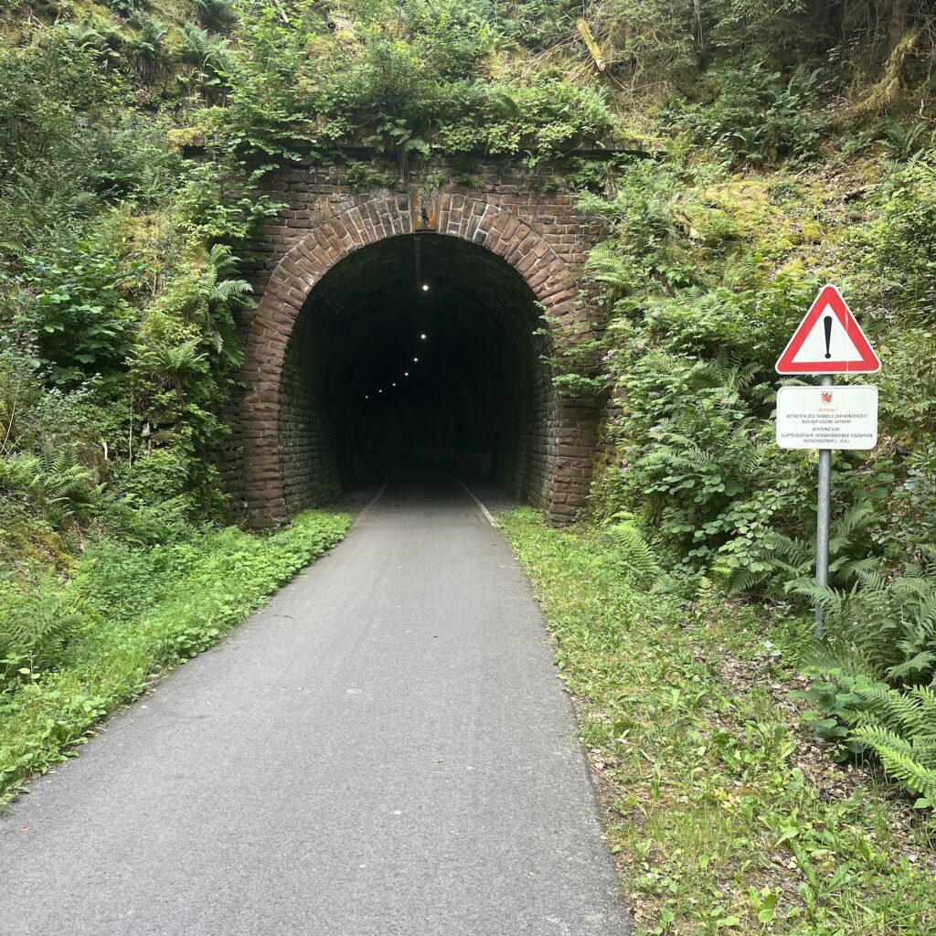 In Plombières kom ik op een oude spoorlijn die onderdeel is van de route naar Monschau. Dat betekent continu stijgen, maar nooit meer dan pakweg 5 procent. Althans, die spoorlijn houdt na een half uurtje op en dan is het weer heftig klimmen en dalen. De echte spoorlijn, de Vennbahn, begint pas in Raeren. Om op het aansluitpunt te komen, moet ik nog een paar hele steile hellingen op, maar gelukkig is er het Bahnhof Café waar instortende fietsers gereanimeerd kunnen worden. Dat doen ze bij voorkeur met bier zo te zien, er is een hele wand met een flessen, maar ik houd het bij sprudelwasser.
