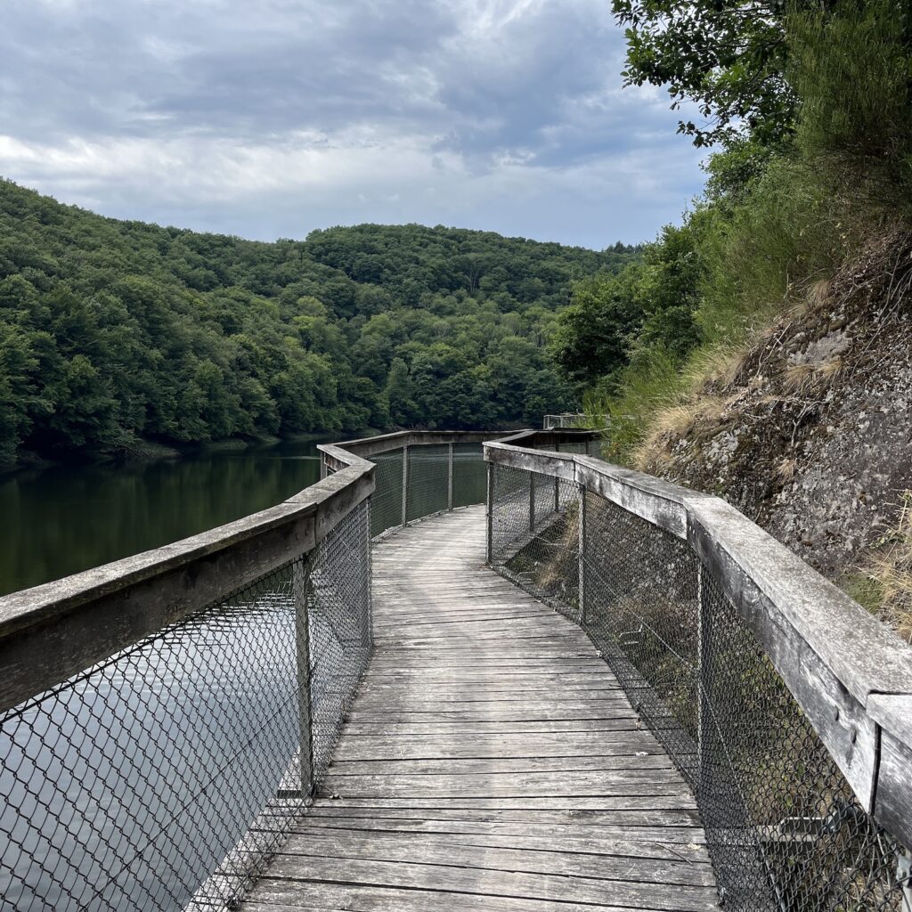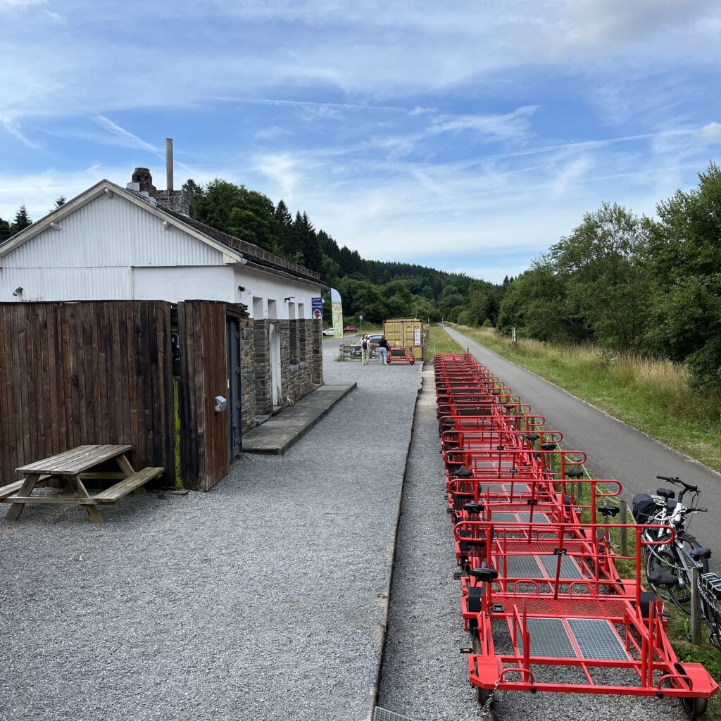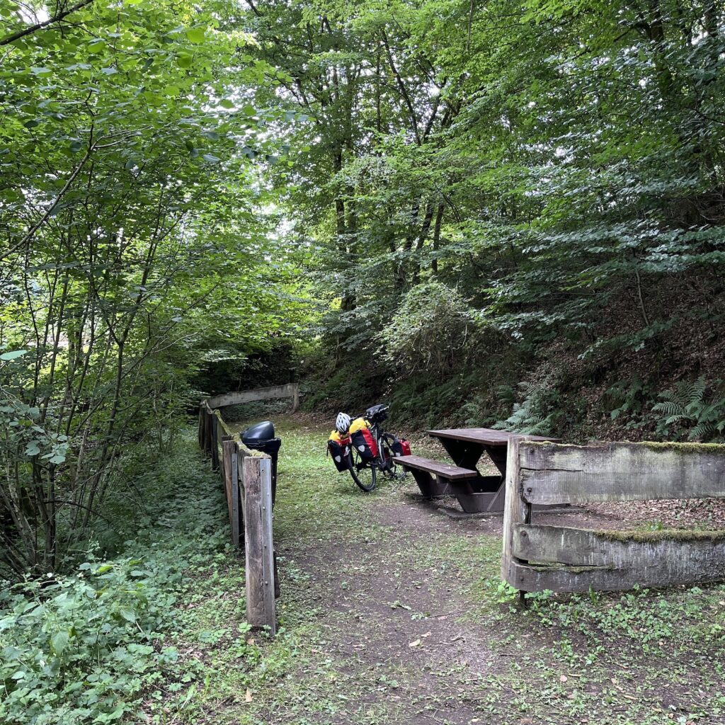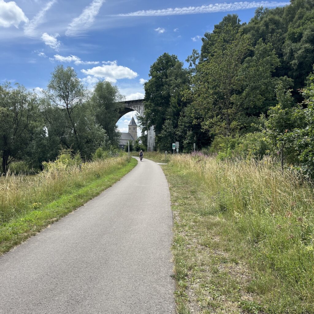 Ik ben relatief laat op weg, over achten, maar het mooie is dat ik alles kan drogen in de zon en dus licht bepakt vertrek. Ik volg de Vennbahn, een langzaam stijgend en dalend fietspad door de bossen dat je van Aken tot Troisvierges kunt volgen. Eenmaal boven op de Ardennen gekomen (550 meter) golft het op en neer en heb je telkens prachtige vergezichten. Af en toe is er een cafeetje langs de bahn, ik drink cappuccino (zwarte koffie met een dot slagroom uit de spuitbus) bij een oud stationnetje. Daar kun je ook draisines huren voor een half dagje trappen over het spoor. Ik fiets heel rustig naar het zuiden, omhoog haal ik gemiddeld 9,5 km per uur, omlaag 20.