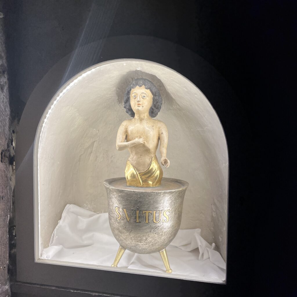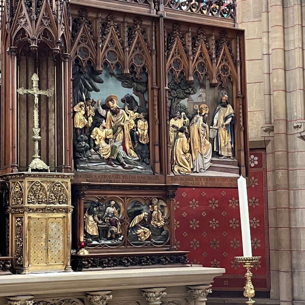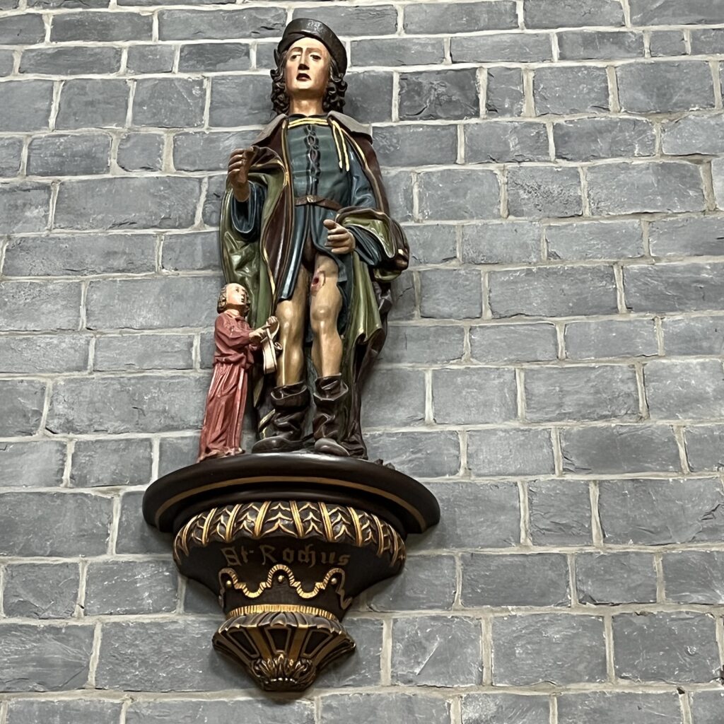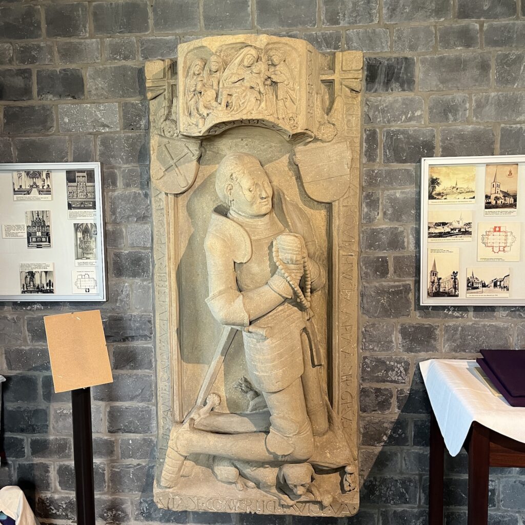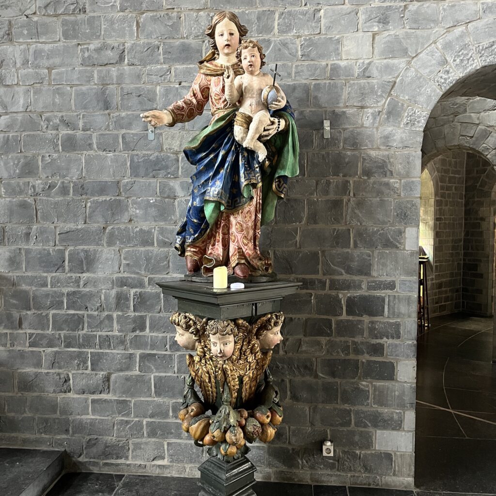 Ik besluit in Sankt Vith te slapen en boek een kamer in Hotel Pip, aanbevolen in het routeboekje naar Basel. Ze hebben een eigen restaurant, dus ik heb hoge verwachtingen. Het stadje blijkt in de Tweede Wereldoorlog volledig in puin gelegd, inclusief de enorme kerk. Die is na de oorlog in megalomane stijl weer opgebouwd, de bevolking van de hele regio past erin. Gelukkig zijn een paar beelden bewaard gebleven. Vervolgens loop ik naar het lokale historische museum, dat een verrassing is. Het is klein, maar bevat een zeer gedegen en actueel overzicht van de geschiedenis, waarbij de lokale ontwikkelingen in een Europees kader geplaatst worden.