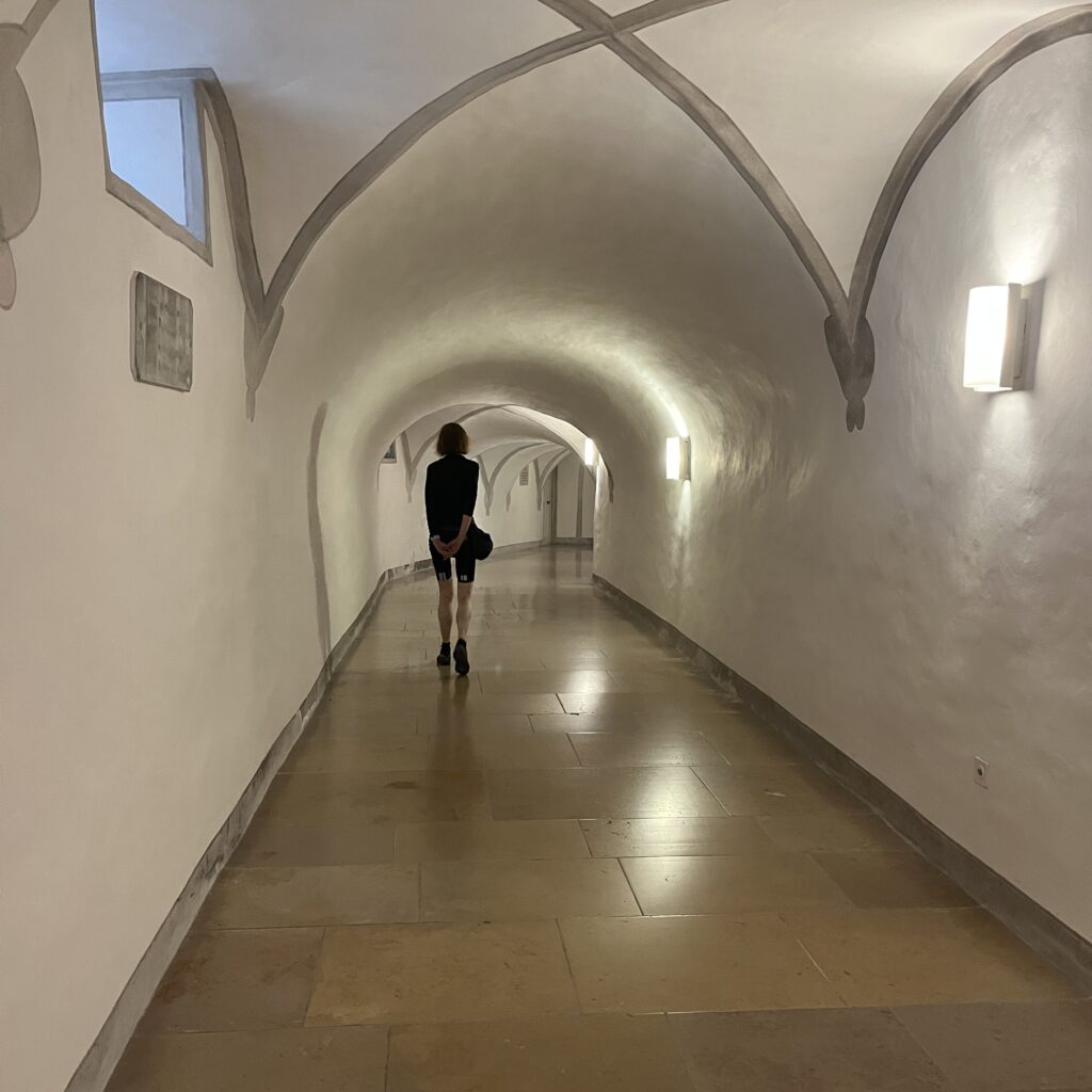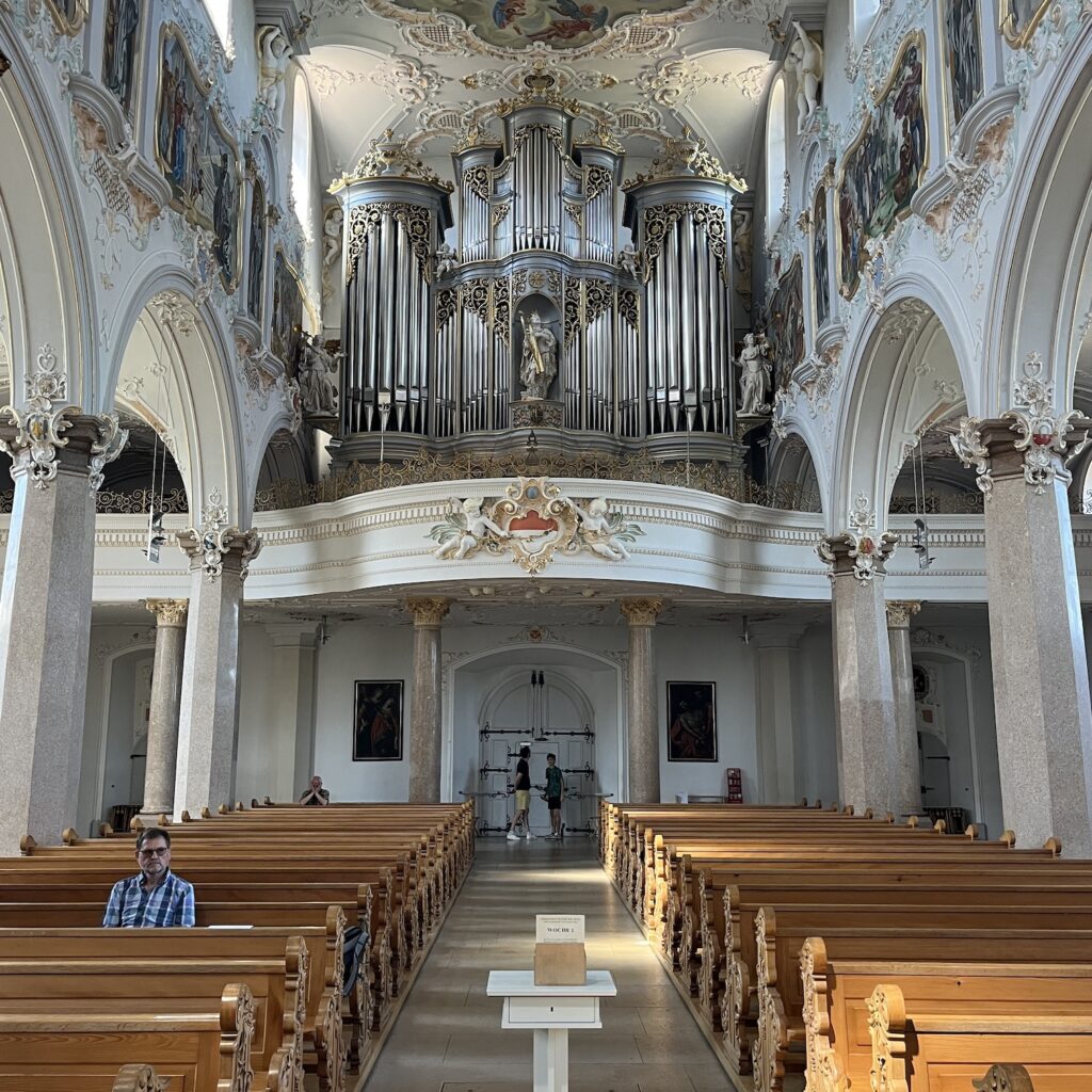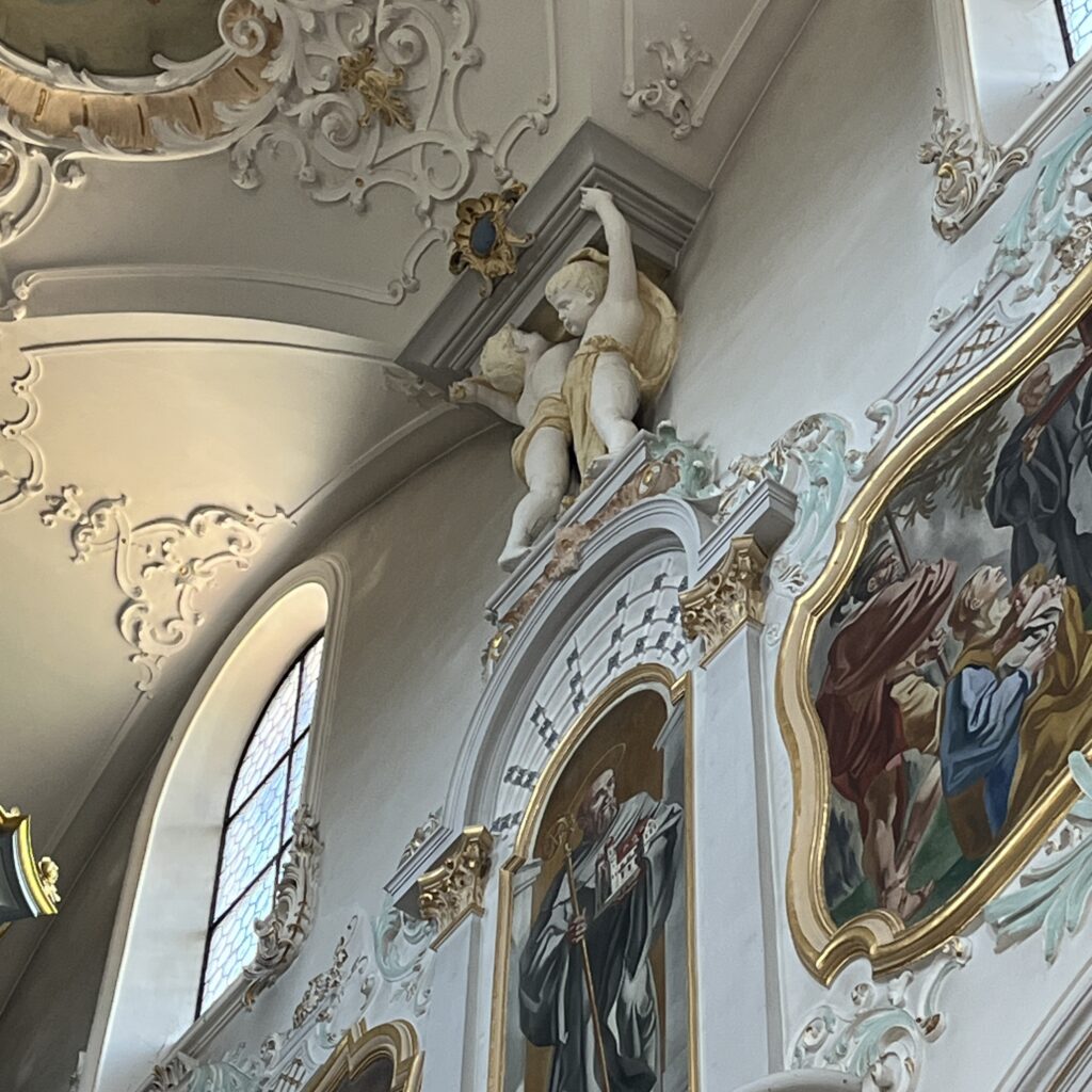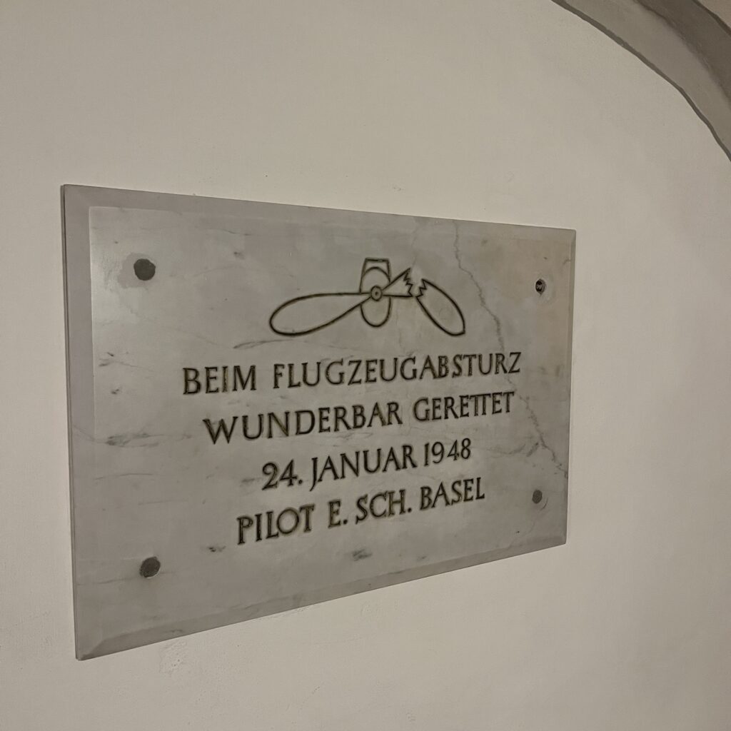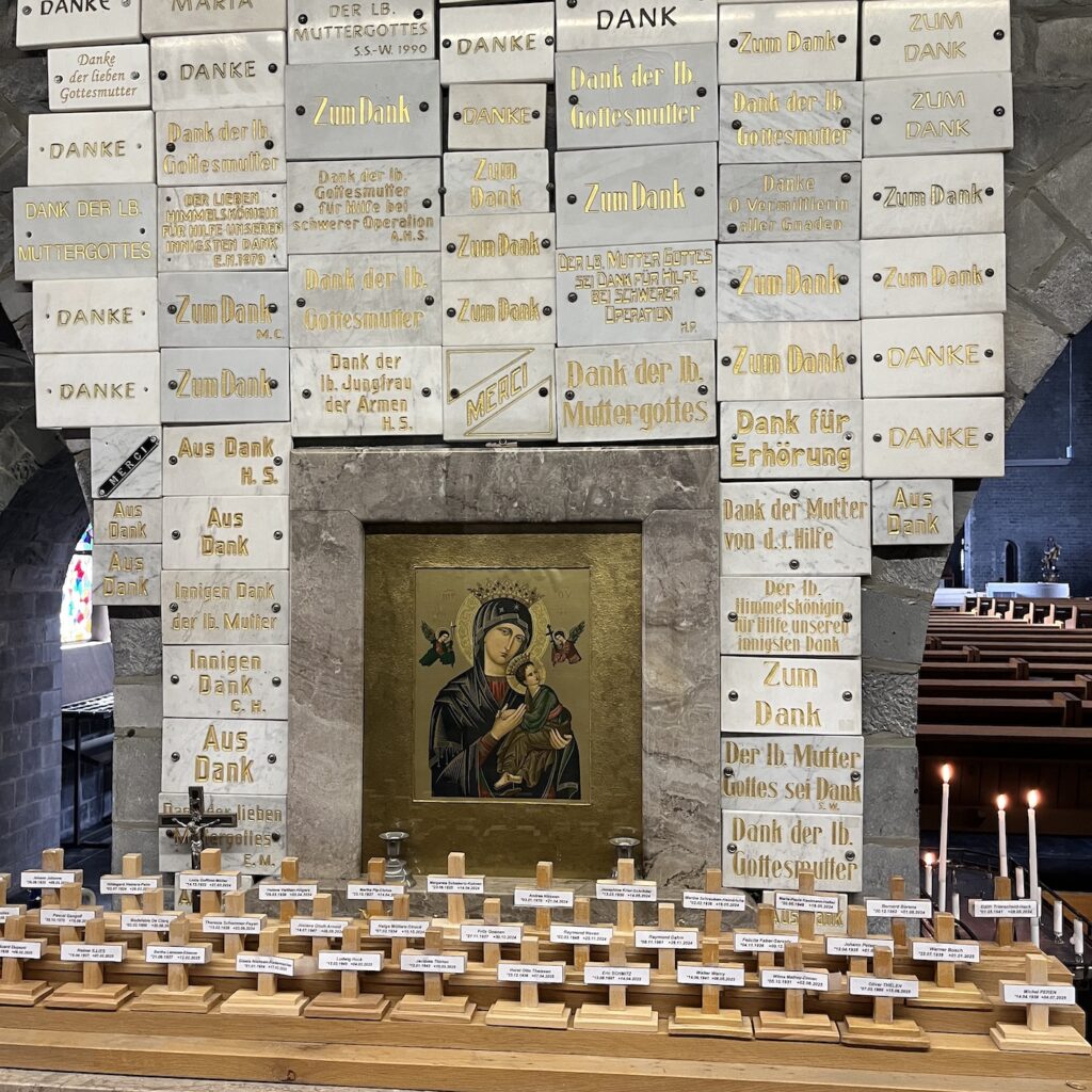 Enfin, eenmaal bovenop werd het een hele lange afdaling tot het laatste heuveltje van Mariastein. Dat is sinds jaar en dag een bedevaartsoord met klooster en kloosterkerk. Die kerk is voorzien van een fantastisch barok altaar, geschonken door Lodewijk de 14e, maar veel zie je er niet van, want het is afgesloten met een zwaar hekwerk. Wat wel leuk is, is dat je door een hele lange onderaardse gang naar een Mariakapel kunt afdalen, de wanden van de gang hangen vol met votiefgeschenken in de vorm van marmeren bordjes, telkens wordt Maria bedankt voor een klein wonder. Wij banjeren daar dan in onze fietsbroeken met blote benen tussen de pelgrims die alle altaren afgaan om te bidden. Nou ja, ze zullen wel een extra weesgegroetje bidden om Maria te vragen ons te vergeven voor dit affront.