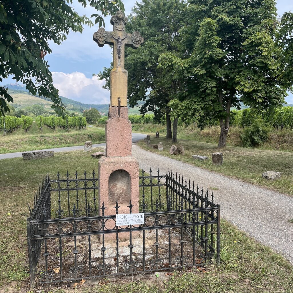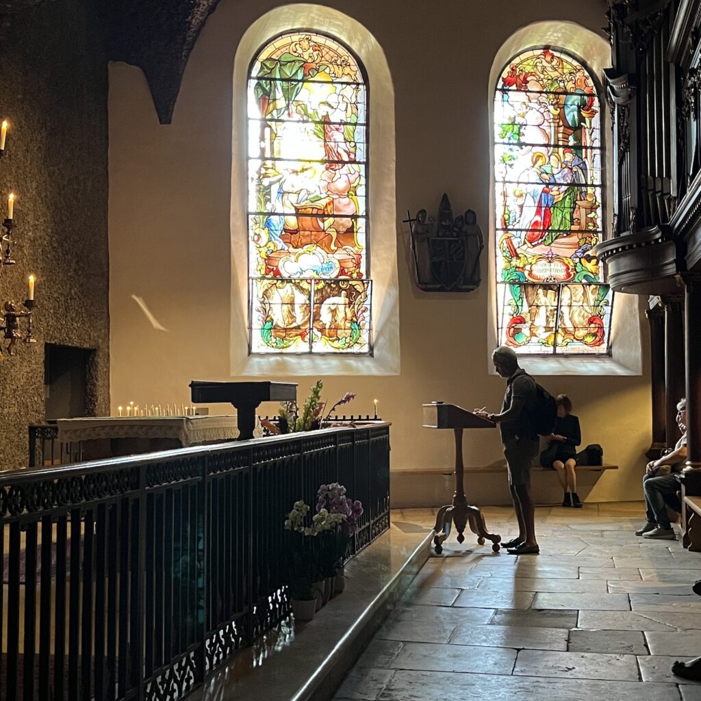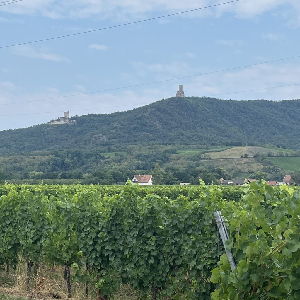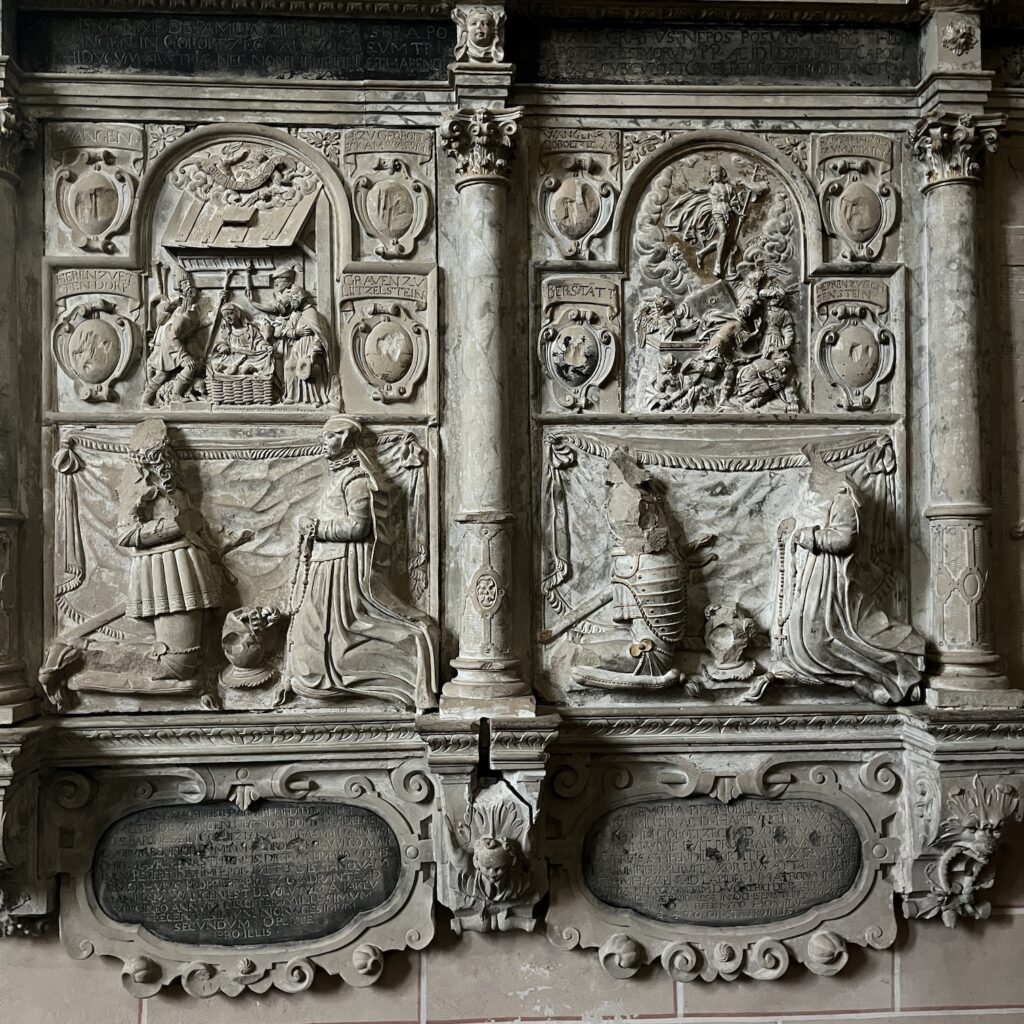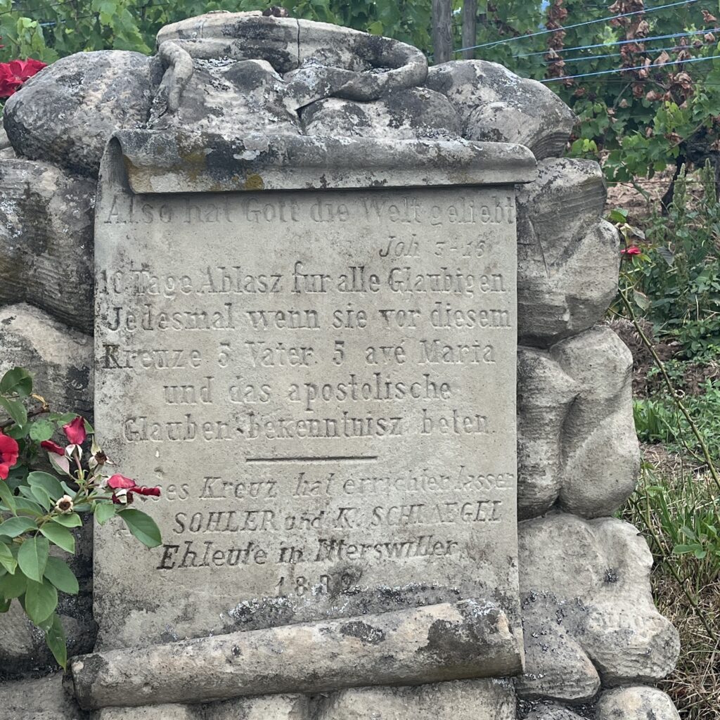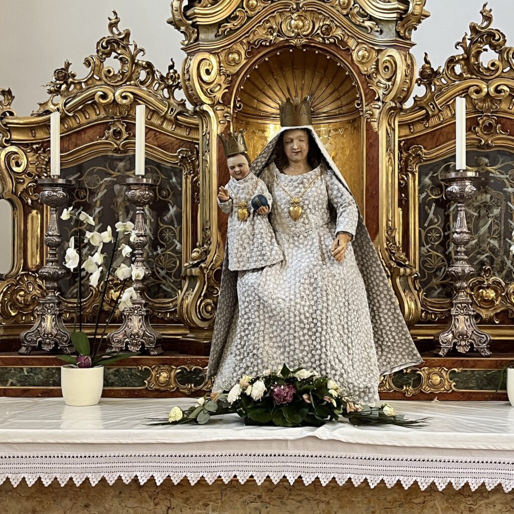 Enfin, eenmaal bovenop werd het een hele lange afdaling tot het laatste heuveltje van Mariastein. Dat is sinds jaar en dag een bedevaartsoord met klooster en kloosterkerk. Die kerk is voorzien van een fantastisch barok altaar, geschonken door Lodewijk de 14e, maar veel zie je er niet van, want het is afgesloten met een zwaar hekwerk. Wat wel leuk is, is dat je door een hele lange onderaardse gang naar een Mariakapel kunt afdalen, de wanden van de gang hangen vol met votiefgeschenken in de vorm van marmeren bordjes, telkens wordt Maria bedankt voor een klein wonder. Wij banjeren daar dan in onze fietsbroeken met blote benen tussen de pelgrims die alle altaren afgaan om te bidden. Nou ja, ze zullen wel een extra weesgegroetje bidden om Maria te vragen ons te vergeven voor dit affront.