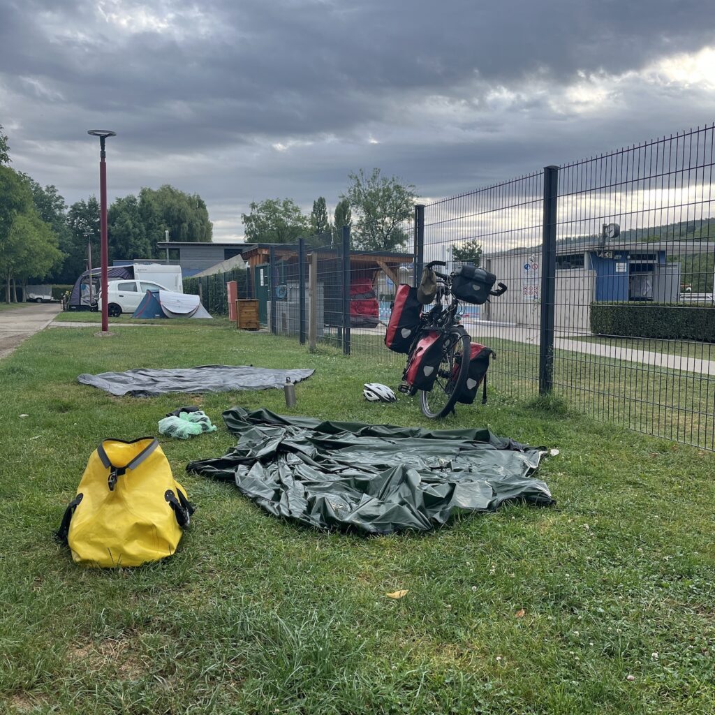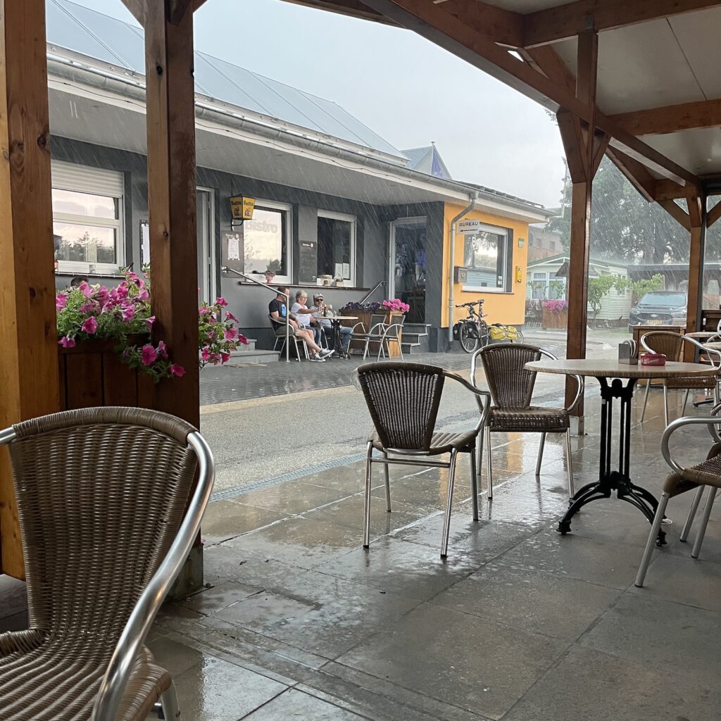 Terwijl ik de tent opzet wordt het zwembad ontruimd vanwege het naderende onweer. Als het dan losbarst, zie ik de regen horizontaal voorbijkomen, terwijl de bomen wild staan te zwiepen. Ik zit lekker droog onder het afdak van het campingterras, maar dan slaat de twijfel toe. Houd de tent dit wel? Of drijven al mijn bezittingen nu over het grasveld richting de Moezel? Dus ik ren door de slagregens naar de tent, maar die staat als een huis. Ik duik er maar in, dan kan ik het van binnenuit meemaken. Als het ergste voorbij lijkt, beginnen er in de verte sirenes te loeien. Betekent dat dat het gevaar geweken is of is dit een waarschuwing voor een vloedgolf of modderstroom? Ik merk geen tekenen van paniek bij de kampeerders en ga er maar vanuit dat alles OK is.