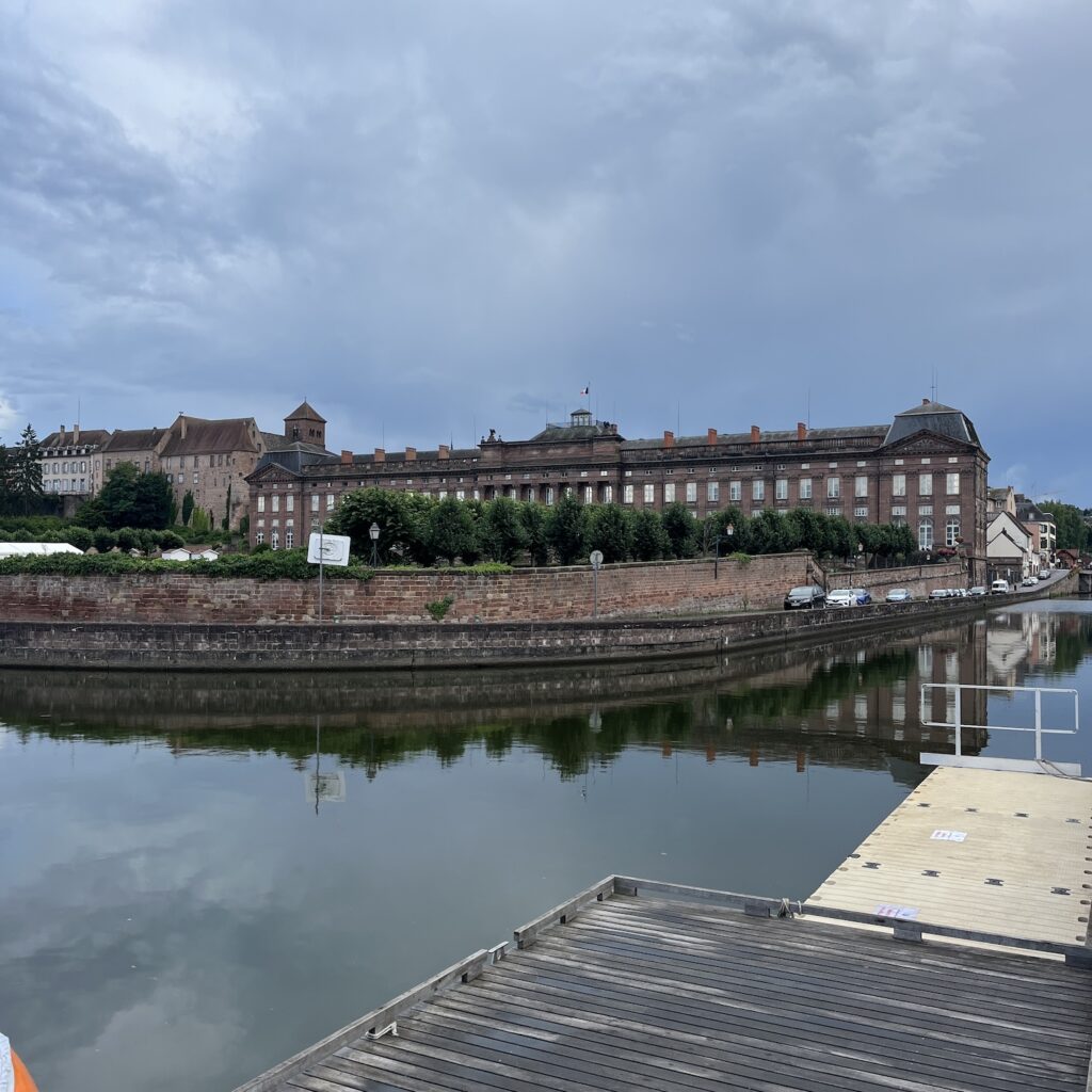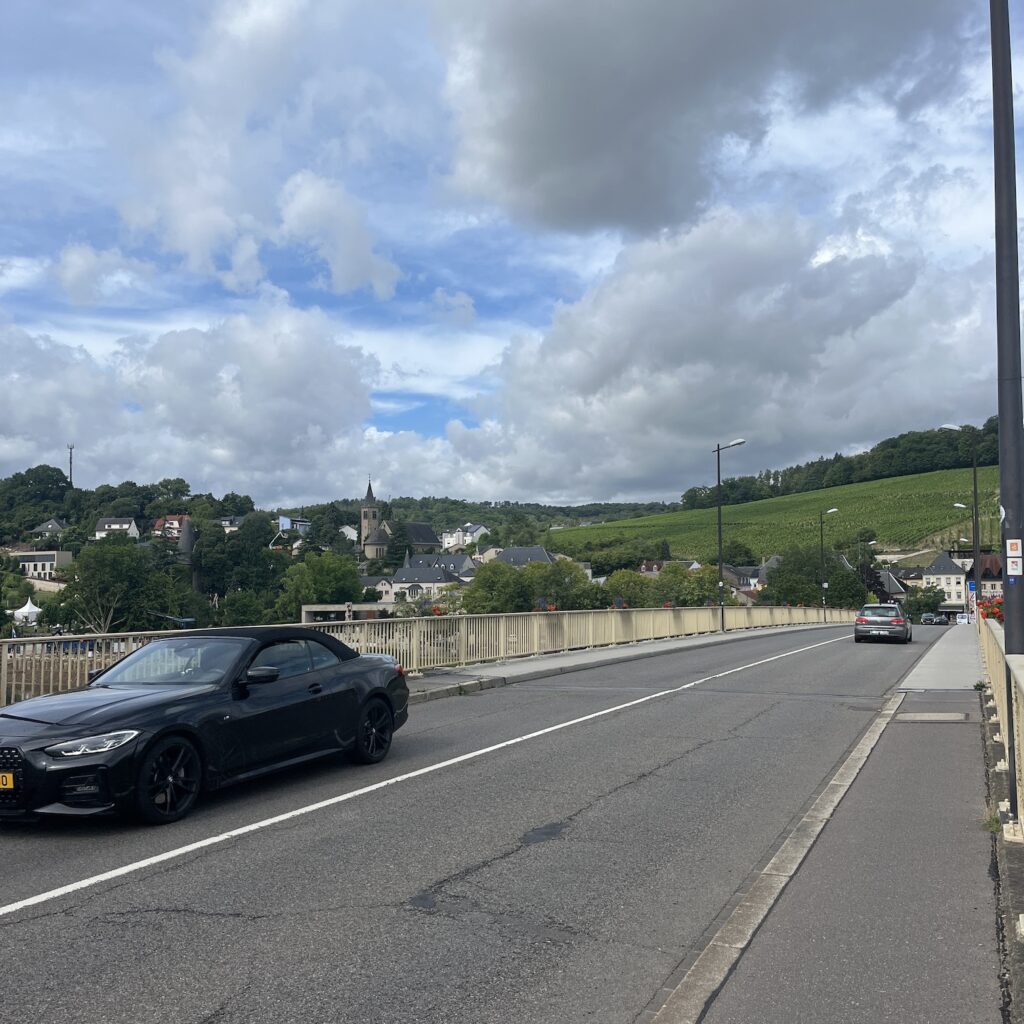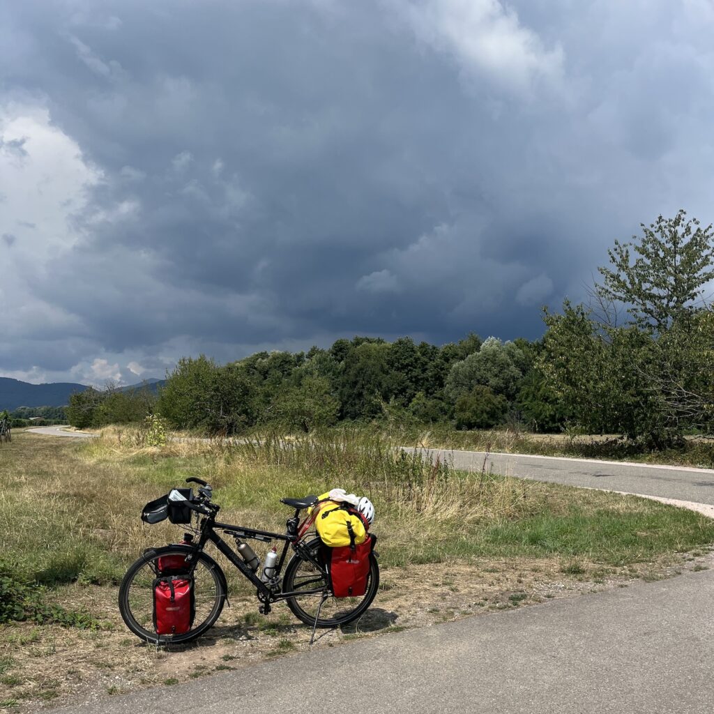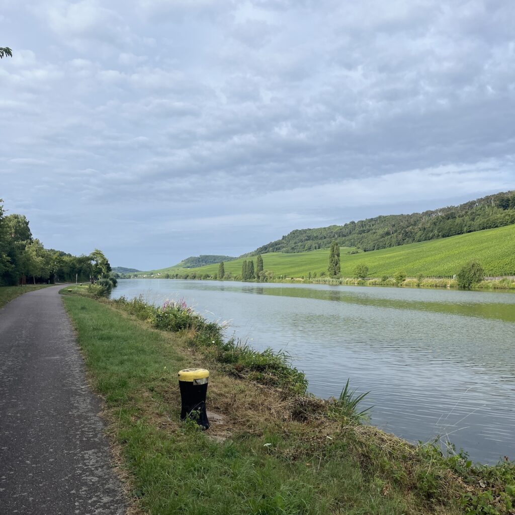 Ik ben om half zeven wel wakker, pak alles in en ga op weg richting Thionville. De route is niet ingewikkeld, je volgt gewoon de rustige oever van de Moezel, de heuvels verdwijnen langzaam en het landschap wordt steeds opener. Ik drink koffie bij een tankstation, want ik heb al snel door dat anders niks wordt met de koffie vandaag. Onder het fietsen luister ik de podcast De vrouw met de duizend gezichten, 8 afleveringen van elk ruim 20 minuten, dat past mooi in de afstand van vandaag. Ik fiets de hele dag richting de buien, eerst zijn het gewoon stapelwolken en daarna wordt de lucht voor mij uit steeds grijzer, totdat ik op de kade van Thionville, 750 meter van mijn doel, alsnog bedolven wordt onder een hoosbui.