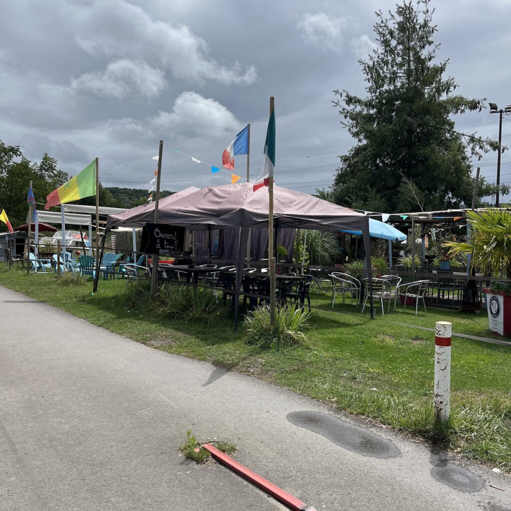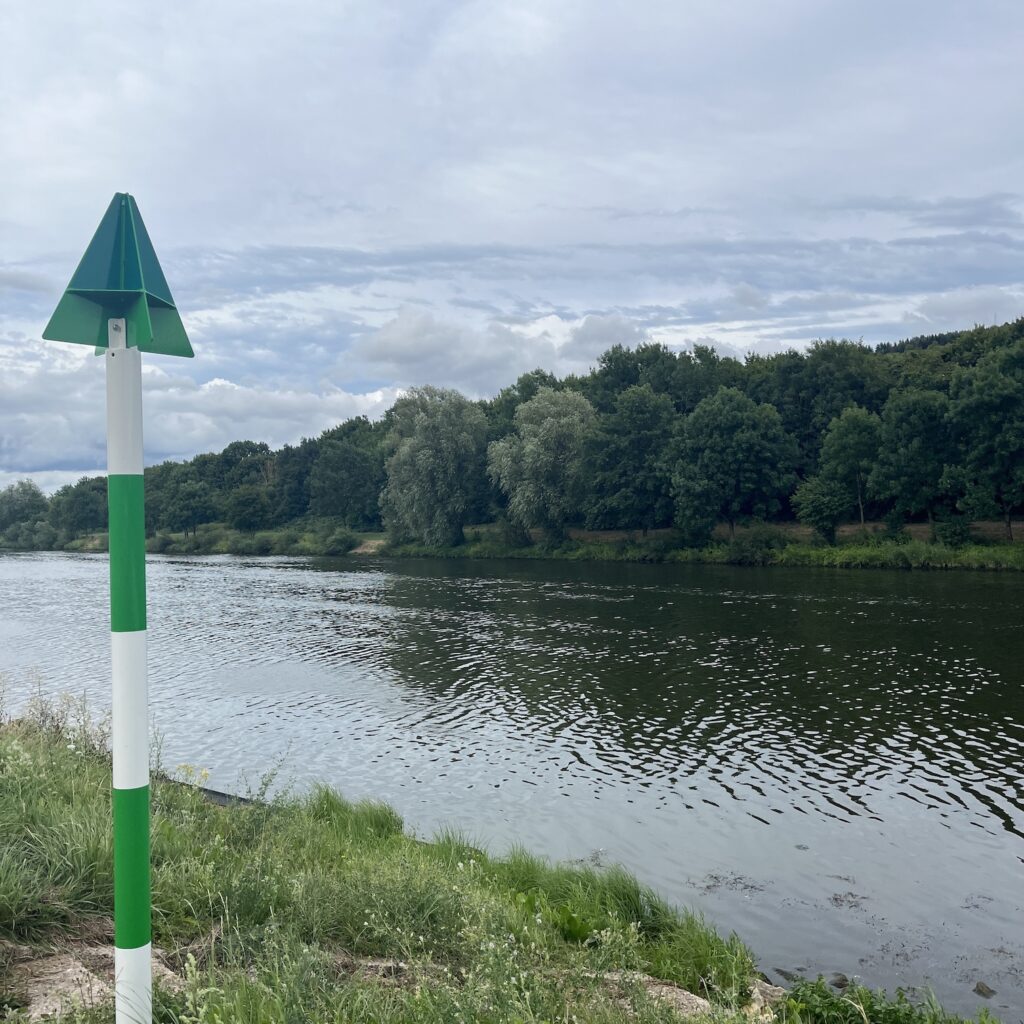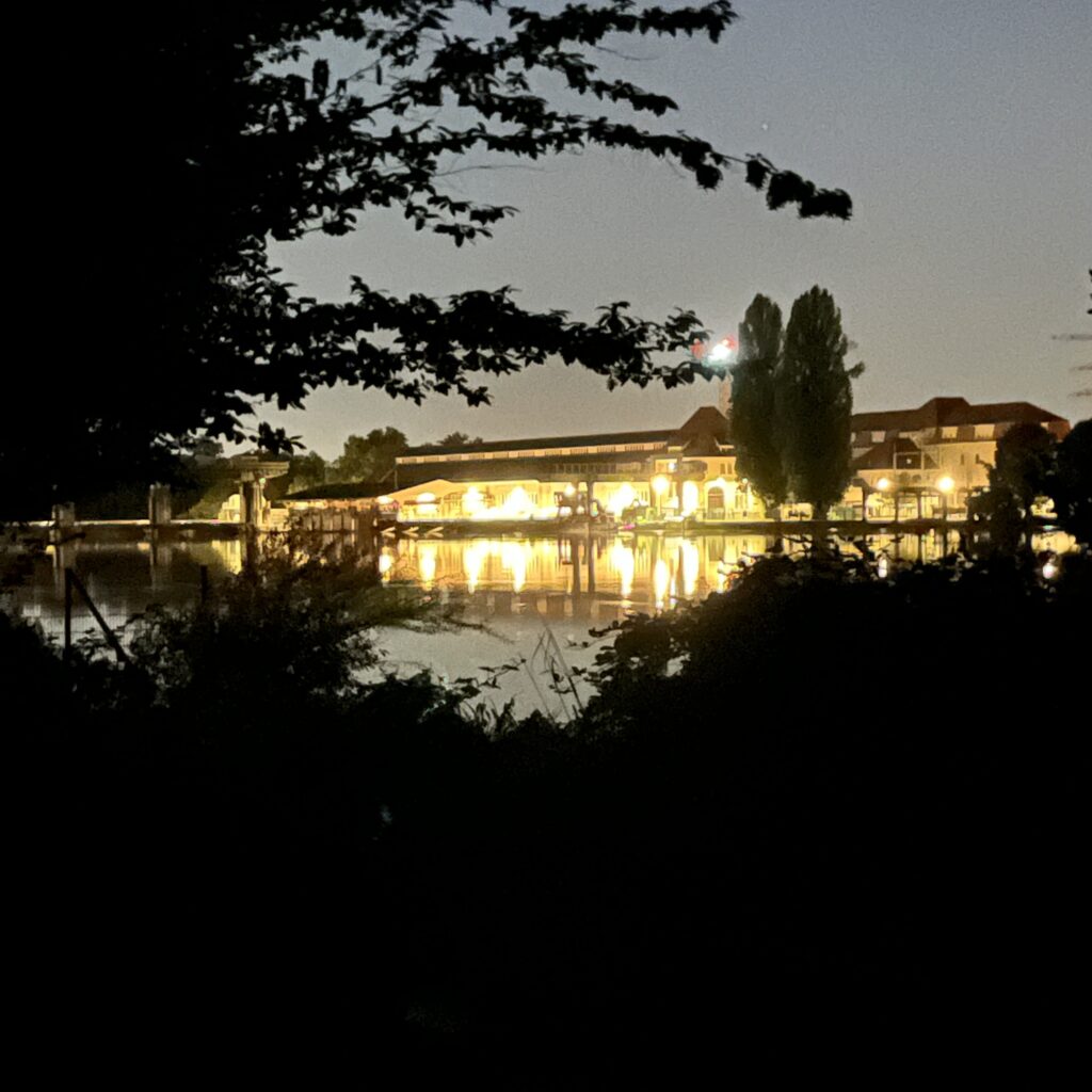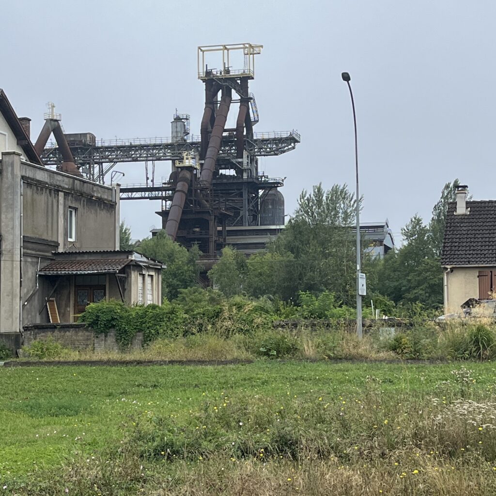 Ik ben om half zeven wel wakker, pak alles in en ga op weg richting Thionville. De route is niet ingewikkeld, je volgt gewoon de rustige oever van de Moezel, de heuvels verdwijnen langzaam en het landschap wordt steeds opener. Ik drink koffie bij een tankstation, want ik heb al snel door dat anders niks wordt met de koffie vandaag. Onder het fietsen luister ik de podcast De vrouw met de duizend gezichten, 8 afleveringen van elk ruim 20 minuten, dat past mooi in de afstand van vandaag. Ik fiets de hele dag richting de buien, eerst zijn het gewoon stapelwolken en daarna wordt de lucht voor mij uit steeds grijzer, totdat ik op de kade van Thionville, 750 meter van mijn doel, alsnog bedolven wordt onder een hoosbui.