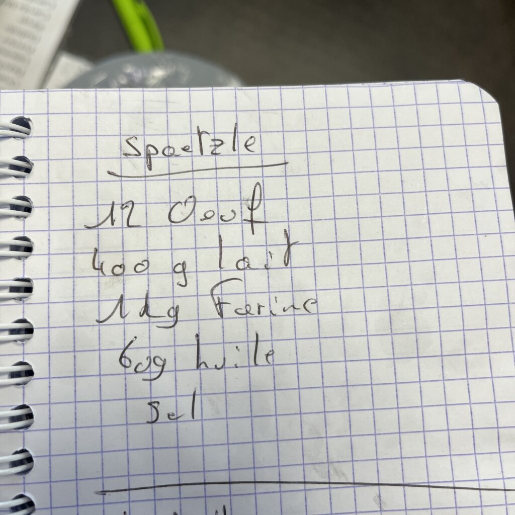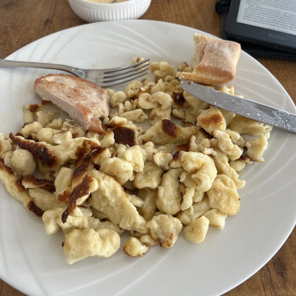 Het was gisternamiddag wel ontzettend heet op het veld en we besloten om in het dorp te eten. We zagen een aardige recensie van Bahnhöfli, we dachten daarbij aan een soort stationsrestauratie, maar het bleek een volwaardige Italiaan met Italiaans personeel. Voor Mayke werd het weer een grote salade, voor mij de tagliatelle met scampi in roomsaus en panna cotta toe.