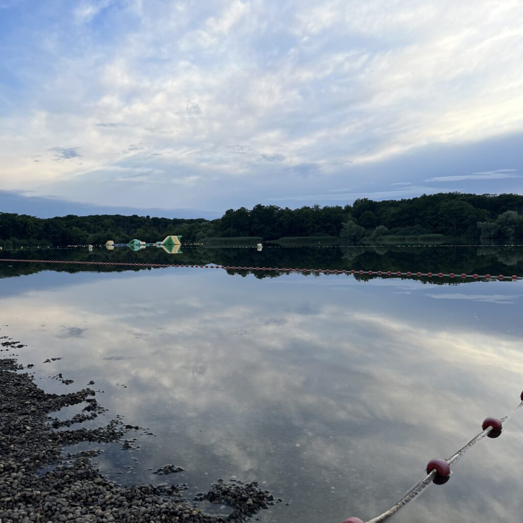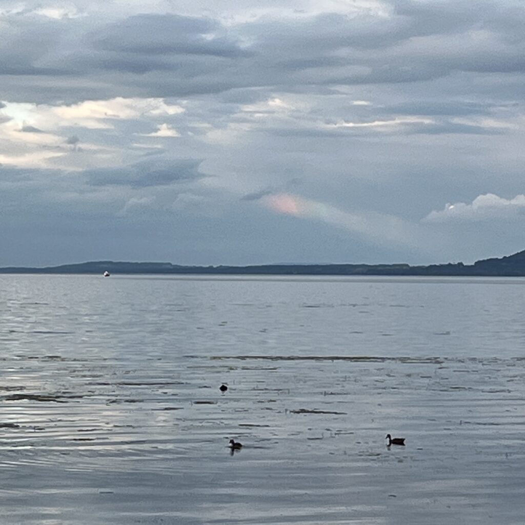 Op de camping en in de omgeving bleef het nog lang feest, de kleine kinderen gaan hier niet voor tien uur naar bed en ergens in de buurt was een rave aan de gang met vuurwerk om 12 uur. Dan denk je, ha nu is het afgelopen, maar nee, de rave dreunde tot half twee over het Lac de Neuchâtel. Niet veel later werd ik wakker met een stijve nek, mijn dure kussentje was leeggelopen. Mopperend maakt ik een soort rol van mijn broek en trui en sliep weer even in. Tot ongeveer vijf uur, als de hemel begint te gloren en bij gebrek aan kraaiende hanen, de babies het op een brullen zetten. En dat alles voor 51 Zwitserse franken!