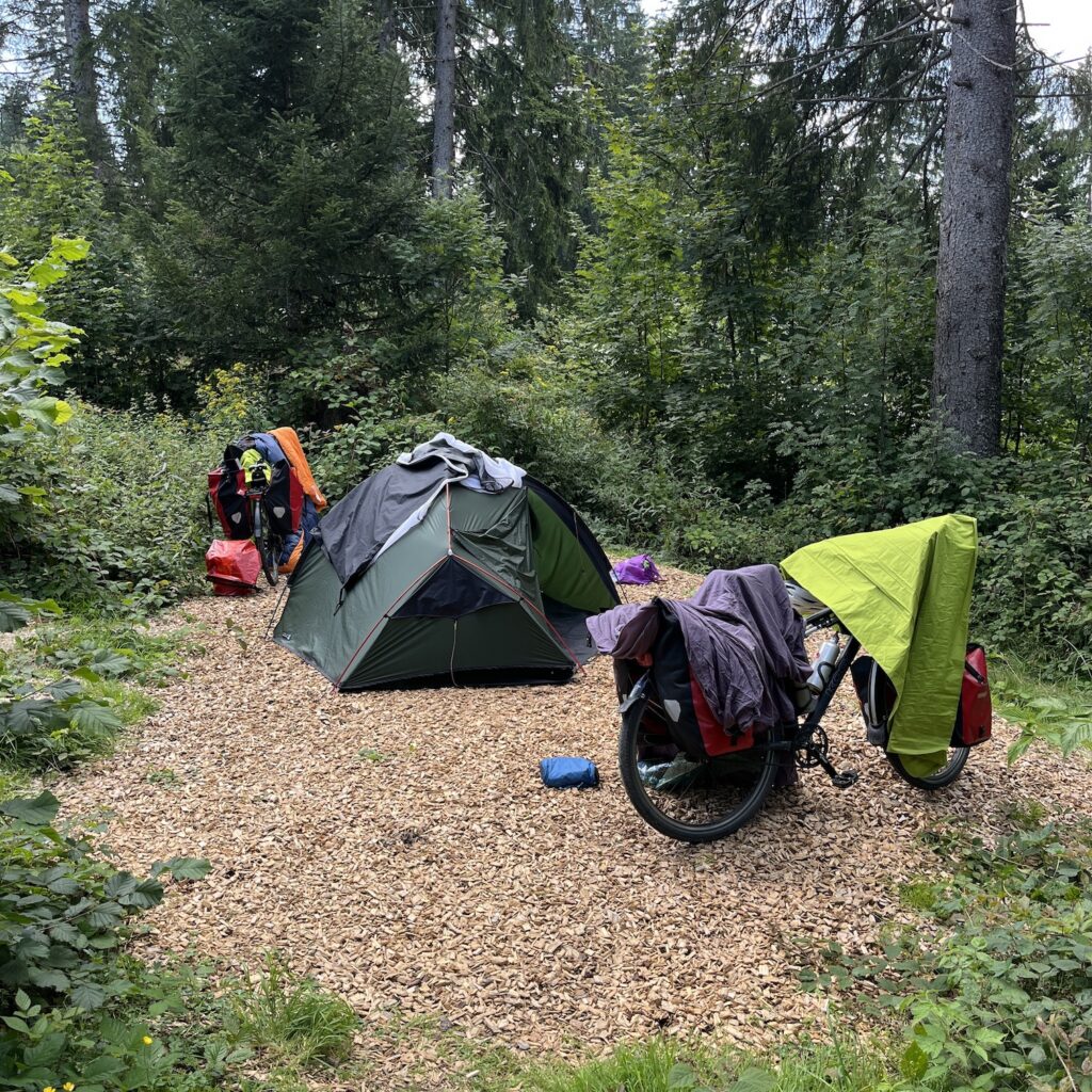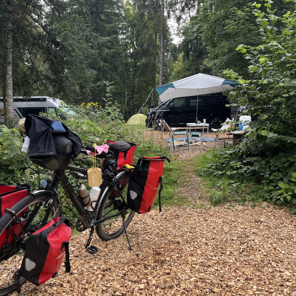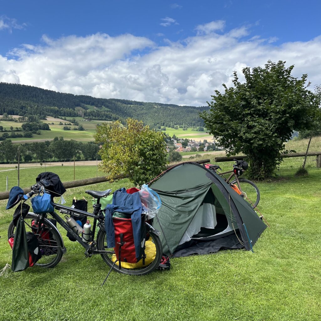 We zijn voor in de middag op de camping, het is een stuk bos met open plekken en bij elke plek een ring van stenen om een kampvuur te maken. Wij vinden een mooi plekje, zetten de tent op en gaan naar het dorp om boodschappen te doen en wat te drinken. Het laatste stuk naar Basel is nog 90 kilometer en er zijn geen campings meer aan de route. Met veel moeite vinden we een bed and breakfast aan de route met self check-in, want op dinsdag en woensdag is er niemand. De huur moeten we in contanten op de kamer achterlaten.