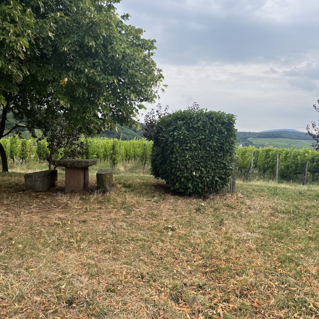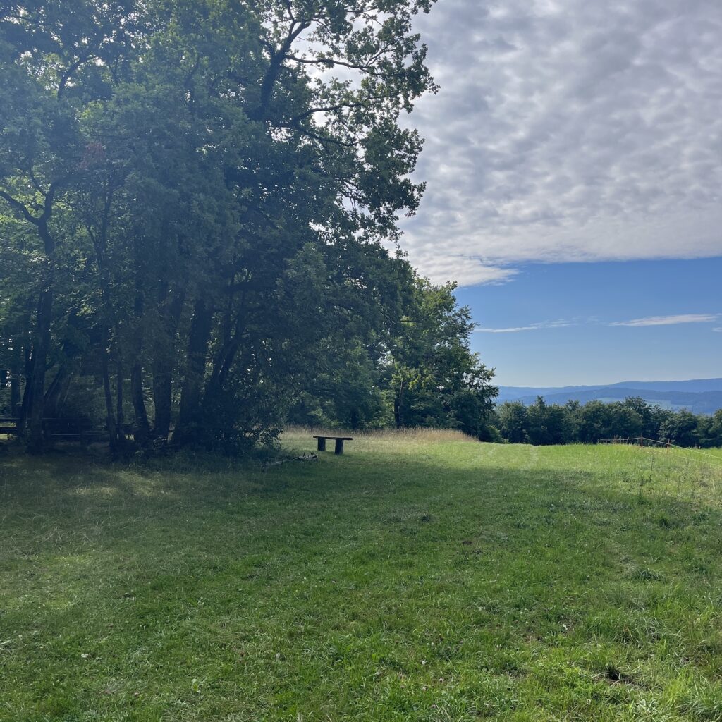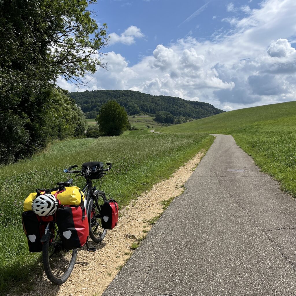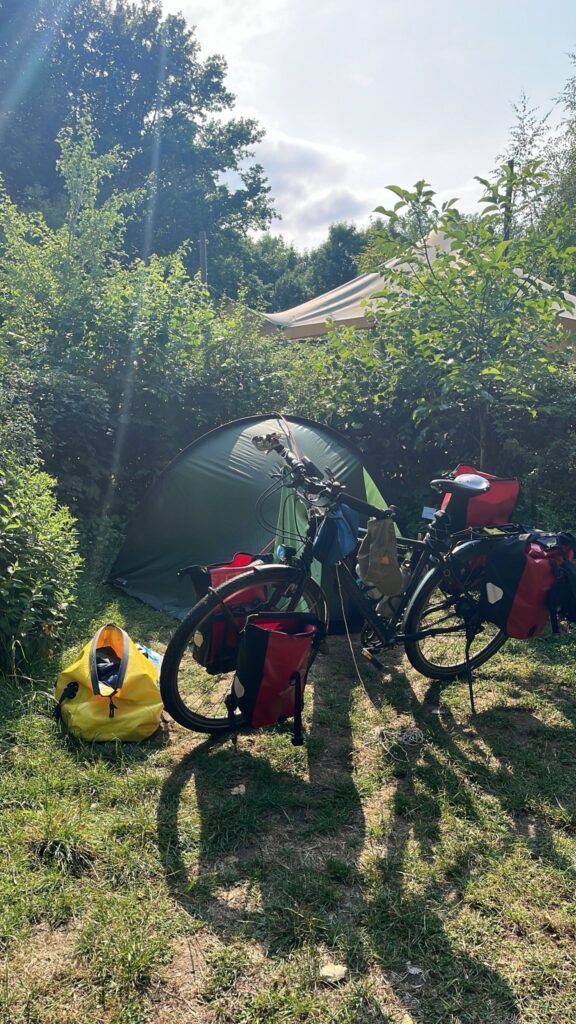 We zijn voor in de middag op de camping, het is een stuk bos met open plekken en bij elke plek een ring van stenen om een kampvuur te maken. Wij vinden een mooi plekje, zetten de tent op en gaan naar het dorp om boodschappen te doen en wat te drinken. Het laatste stuk naar Basel is nog 90 kilometer en er zijn geen campings meer aan de route. Met veel moeite vinden we een bed and breakfast aan de route met self check-in, want op dinsdag en woensdag is er niemand. De huur moeten we in contanten op de kamer achterlaten.