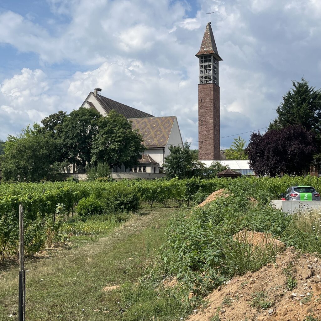 Na Mariastein raken we geleidelijk aan in de agglomeratie van Basel. We hebben vanaf morgen weer het appartement in Riehen, dus vandaag kamperen we nog. We hebben een leuke camping aan de Rijn uitgezocht in Kaiseraugst, een voorstadje van Basel :”Sie haben ein kleine Stück Paradies entdeckt” juicht de website. We bedenken zelf de makkelijkste route naar de camping en raken verstrikt in een spoorwegemplacement tussen de fabrieken, gelukkig is er één uitweg, een wandelpad door een stuk bos. Daar mag je eigenlijk niet fietsen en dat krijgen we in onvervalst Schweitzerdeutsch te horen, maar wij lachen gewoon vriendelijk terug en roepen “ hello!”
