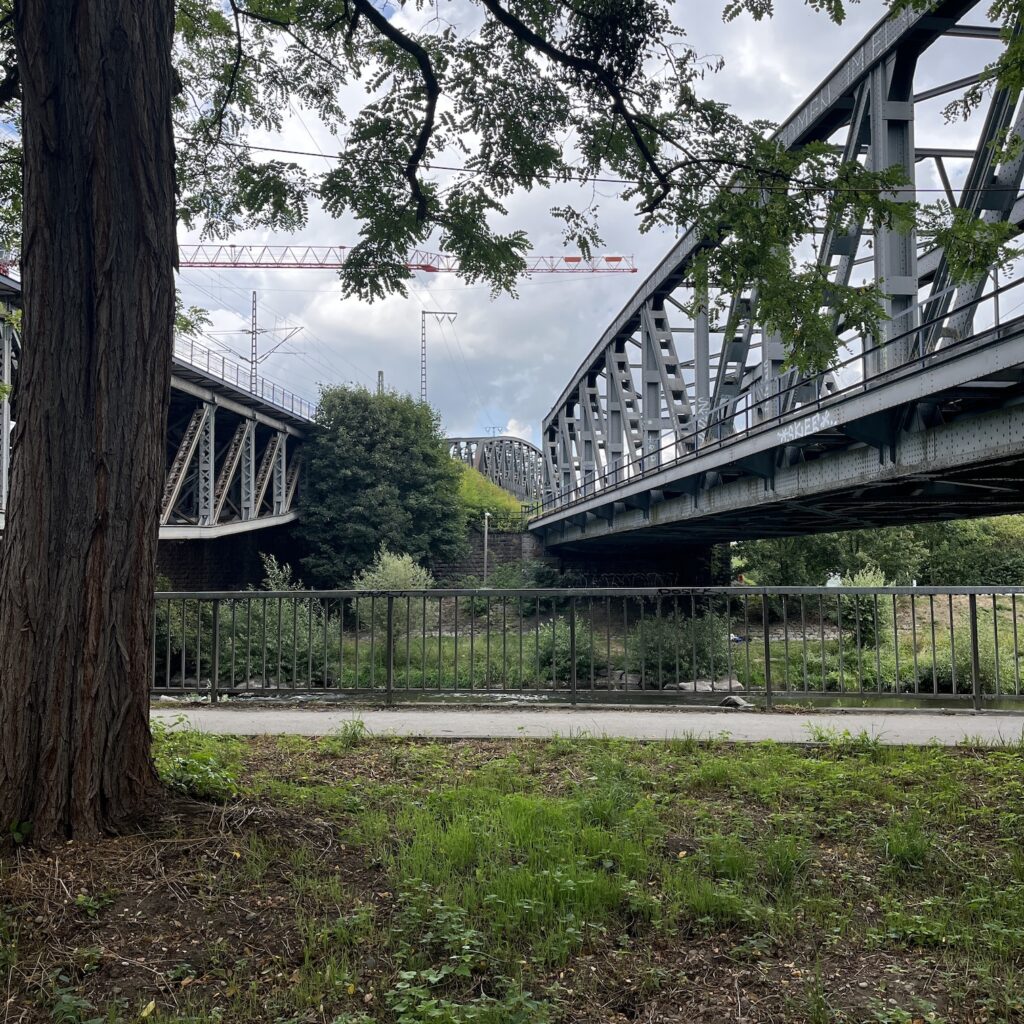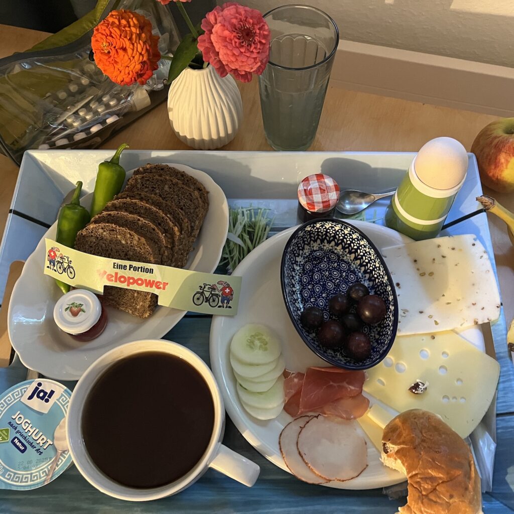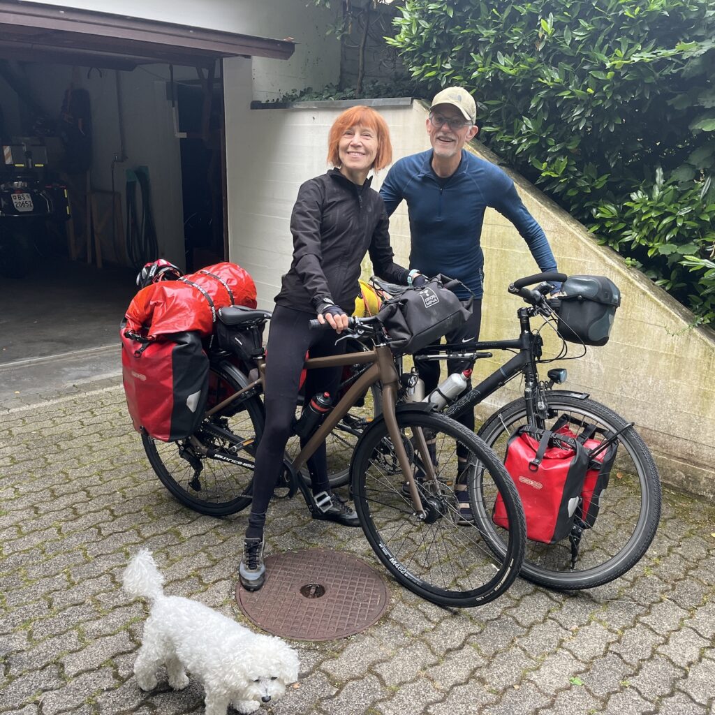 Natuurlijk zijn we weer vroeg wakker en we zijn ruim op tijd op het station. Gisteren hebben we een beetje onderzoek gedaan en het lijkt slimmer om niet naar het Centraal Station van Basel te gaan maar naar Basel Bad. Dat ligt aan onze kant van de Rijn, is een stuk rustiger en je kunt de fiets makkelijk op het perron krijgen. Het is een mooi fietstochtje door het bos vanaf Riehen. Ik geef mijn fietsgids Maastricht – Basel aan Tobias en Silke ter inspiratie. Deze zomer fietsen ze naar Bretagne, maar ze willen nog een keer naar Amsterdam. Alleen lijkt de route langs de Rijn ze niet zo leuk vanwege alle industrie langs de oevers en daar hebben ze gelijk in. Ik ben in 2022 langs de Rijn naar de Main gefietst en je ziet heel wat fabrieken onderweg.
