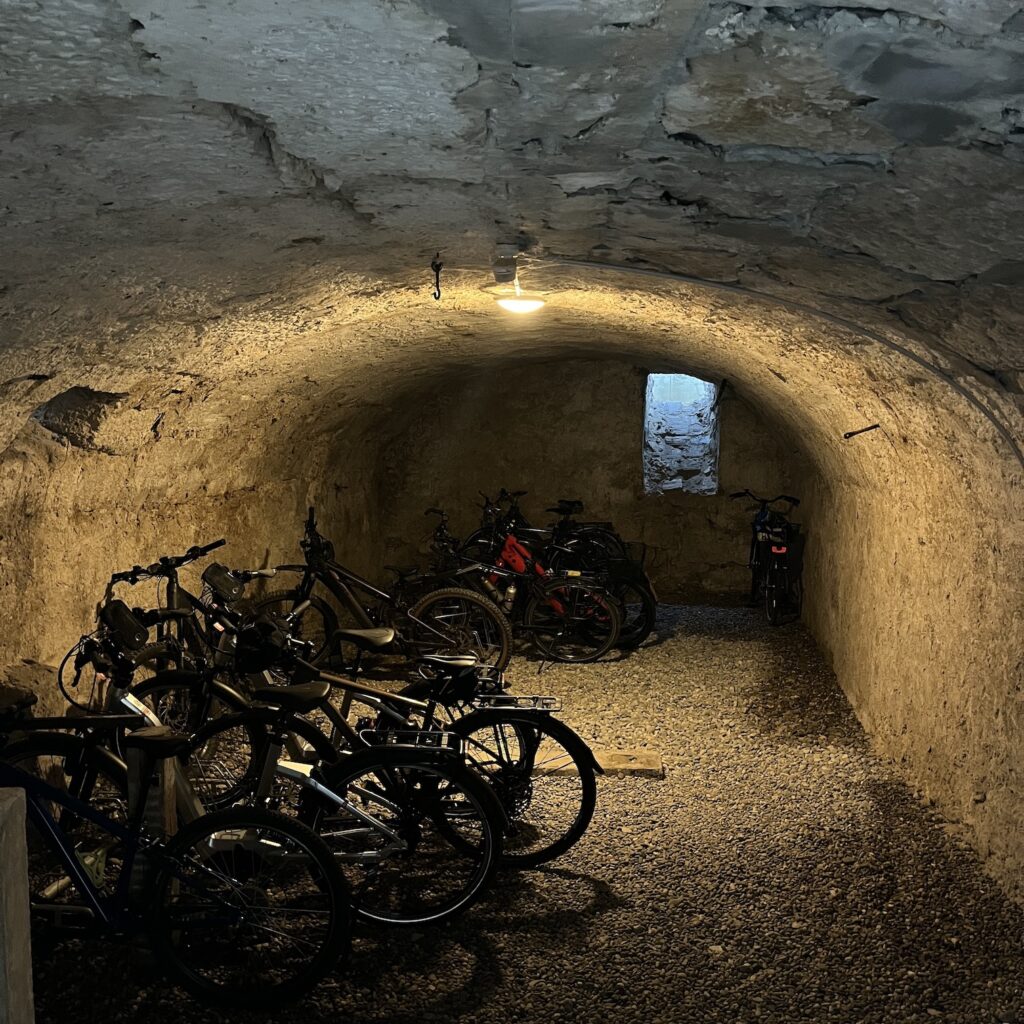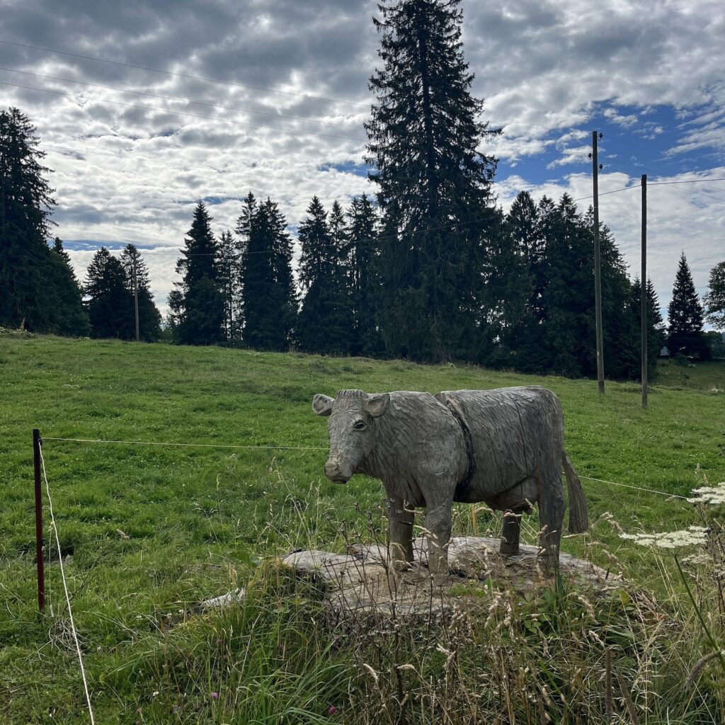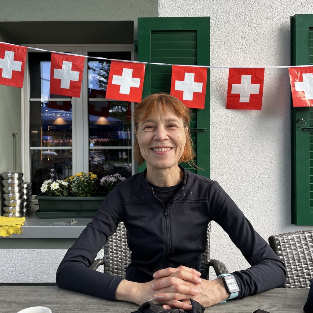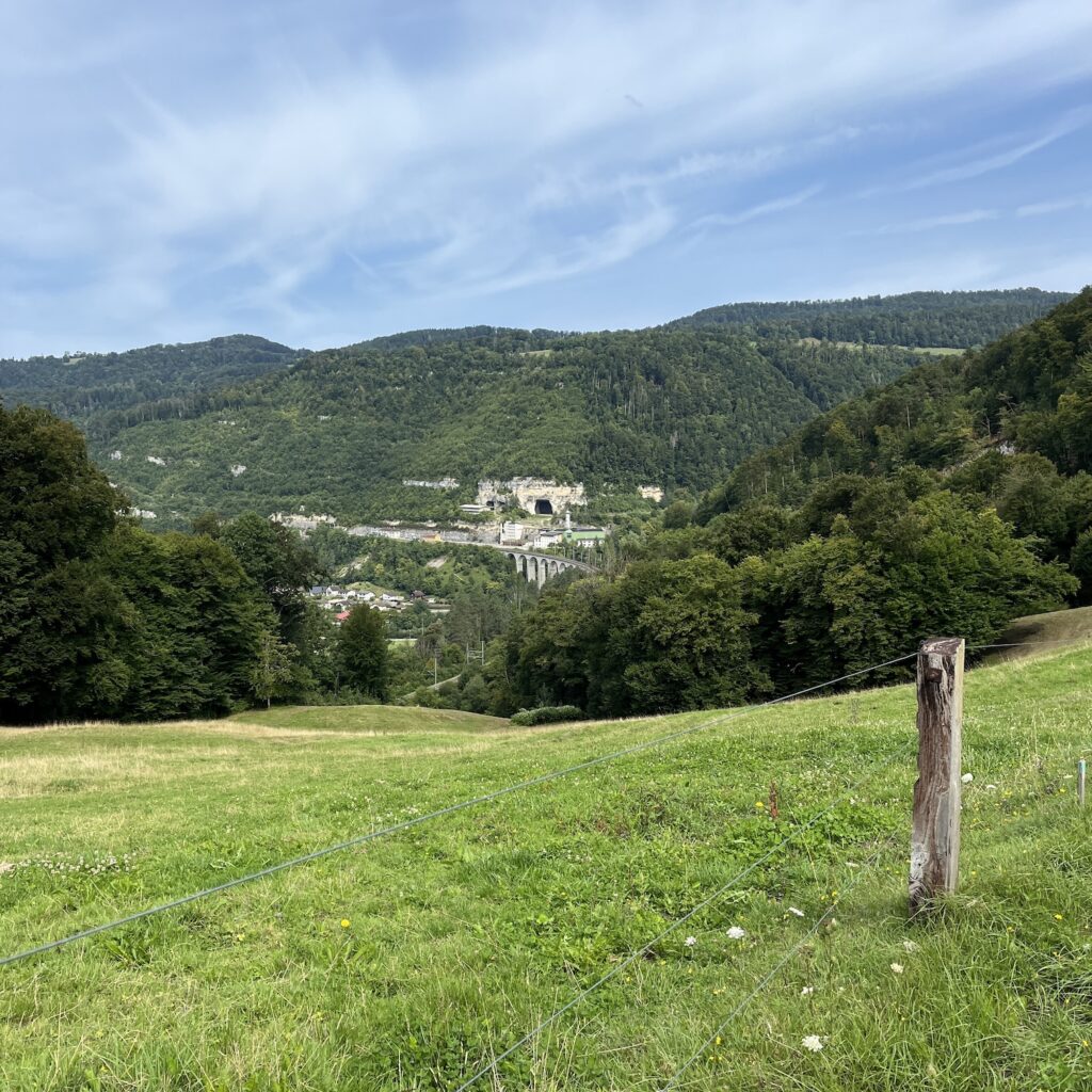 Als we om kwart over zes opstaan, is het weer zo ongelooflijk koud, onze adem maakt dampwolken als we met elkaar praten. De hele ochtend blijft het fris, we fietsen vrij hoog over een soort van richel en dalen dan af naar Saint Ursanne. Onderweg zien we een innovatie die bij wet verplicht zou moeten worden, koeien met grote blauwe tags om hun nek in plaats van bellen. De boer downloadt de app findmycow (dat klinkt toch beter dan Woistmeinkuh) en ziet ze real-time op de kaart bewegen. En zo zijn niet alleen de dove boeren uit de brand geholpen, maar zien we een drastische daling van bovine neuroses en slaap ik ook beter.