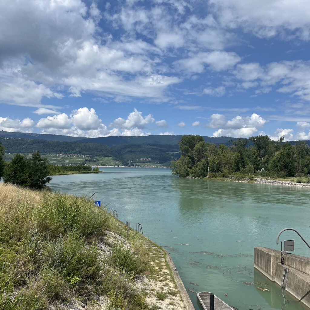 Iets voorbij Biel stoppen we voor een lunch en daar zit een Zwitsers echtpaar dat we gisteren bij de cellulosefabriek ontmoet hadden. Daarna volgen we de zuidelijke oever van het Lac du Bienne en zo geraken we vanzelf in Thielle. Het is een leuke en afwisselende route vandaag, die grotendeels de rivier de Aare volgde.