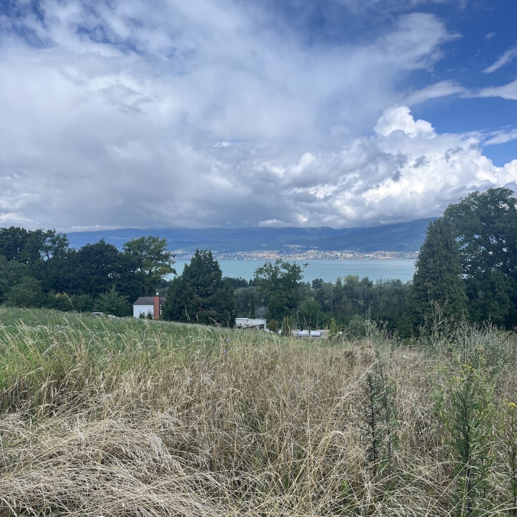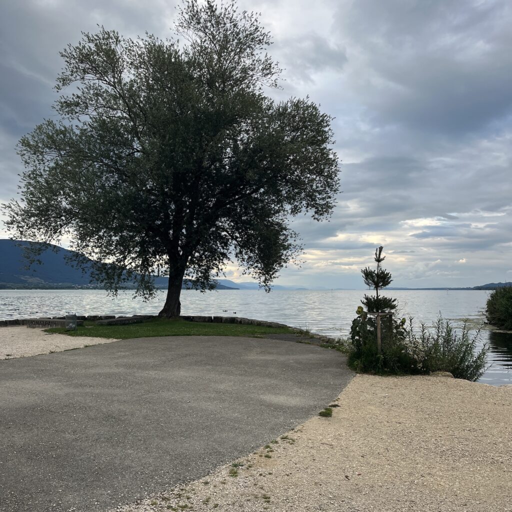Als we opstaan is het droog, we hoeven vandaag maar 50 kilometer (denken we) naar Yverdon les Bains en de route ziet er geruststellend uit, langs de zuidelijke oever van het Lac de Neuchâtel. Aan de plaatsnamen te zien, zitten we hier precies op de taalgrens tussen Duits en Frans. Naar het noorden en westen zijn het Franse namen namen, naar het oosten en zuiden Duitse.