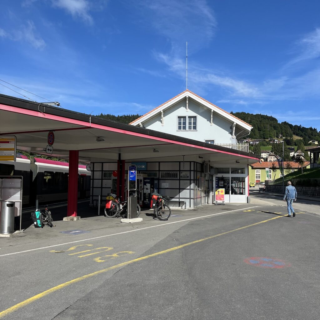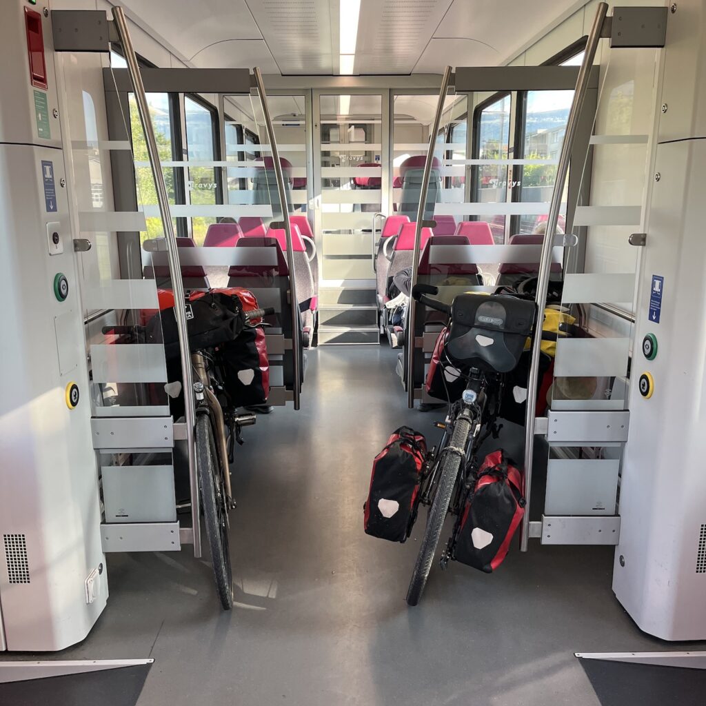 Om half zeven zeggen we, kom we gaan eruit, dan zijn we mooi op tijd op het station voor Rail Away ervaring naar Sainte Croix. Je zit gewoon in een moderne treinstel met tien andere passagiers en er is plek zat voor onze fietsen, die natuurlijk bij de eerste bocht meteen omdonderen. Een vriendelijke mevrouw wijst ons op de riemen die je uit de wand kunt trekken om de fietsen mee vast te zetten. Die Zwitsers denken ook aan alles! Het uitzicht is bij vlagen mooi, maar meestal zien we bomen.