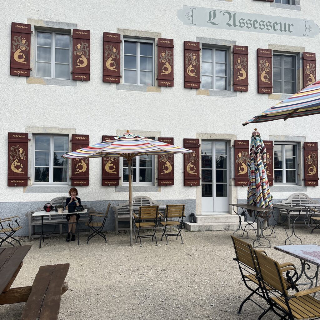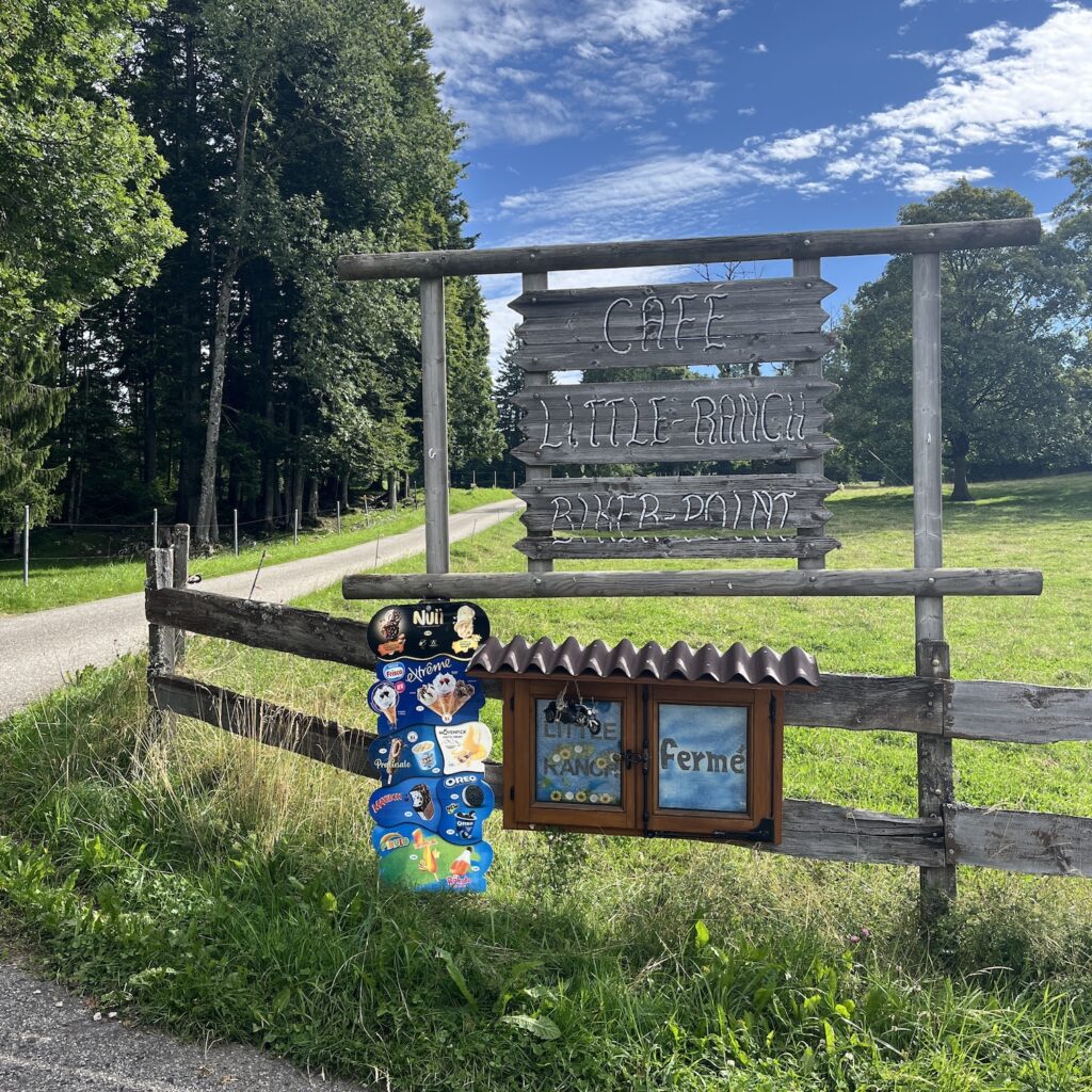 Meteen na Travers begint een klim van vier kilometer met een gemiddeld stijgingspercentage van 9%. We moeten van 750 naar 1100 meter. We pauzeren elke kilometer even en zo lukt het ons in een klein uurtje om boven te komen. Dan fietsen we gauw door op zoek naar koffie, die vinden we in de stationsrestauratie van Les Ponts de Martel, een uiterst naargeestig etablissement, waar ze de worsten voor de lunch aan het bereiden zijn. Gelukkig kun je ook buiten zitten.