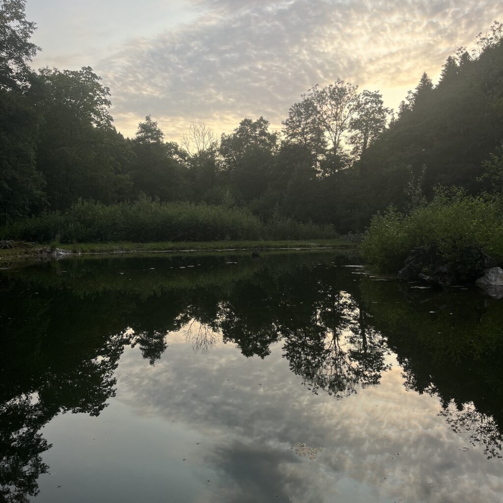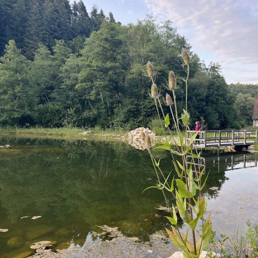 Gisterenavond aten we brood op het terras van het hotel, dat immers Ruhetag had. Dit keer was er alle aanleiding voor de Romantische Avondwandeling, de eigenaresse had ons gewezen op de vijverpartij achter het hotel en die moesten we natuurlijk gaan bekijken. Het geheel stelde ons niet teleur, het water was weliswaar iets troebel, maar het riviertje de Lucelle, dat trouwens de grens tussen Zwitserland en Frankrijk vormt, biedt ook mooie watervalletjes om naar te kijken.