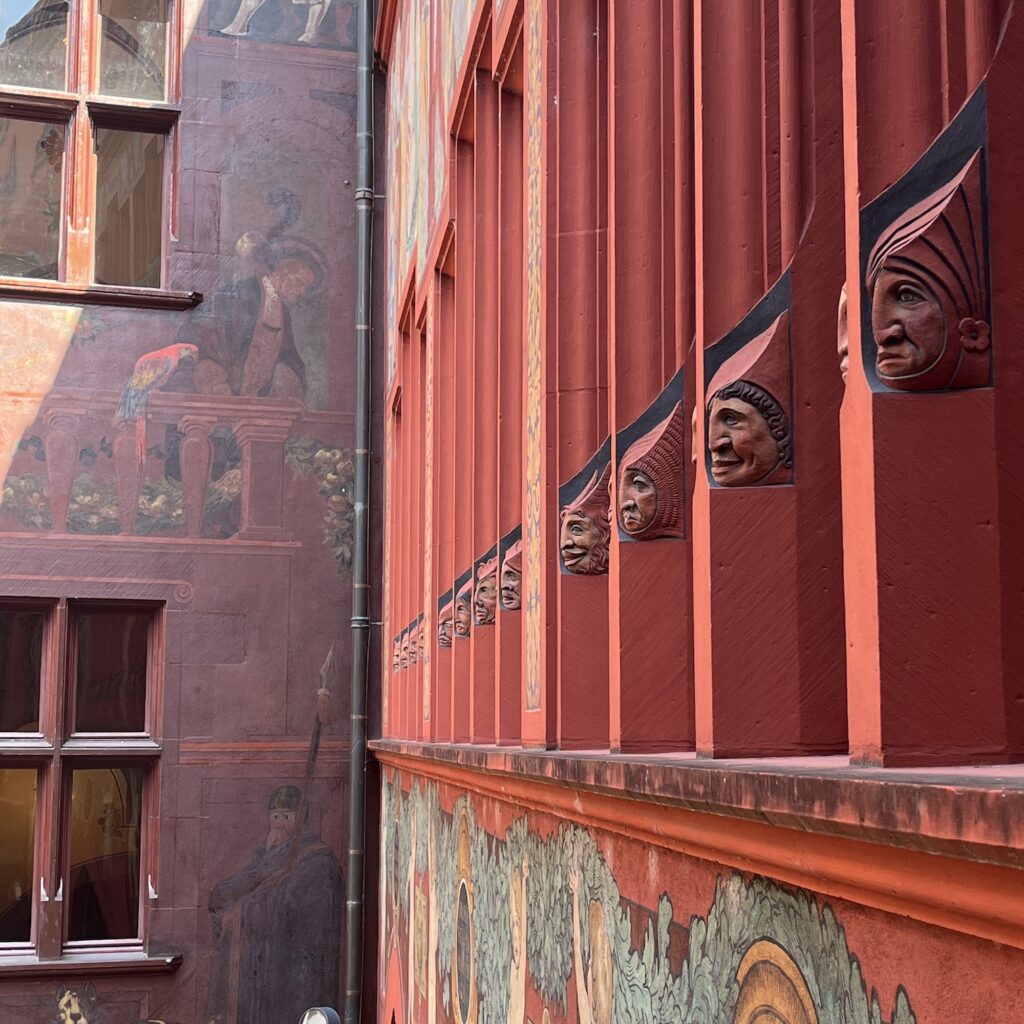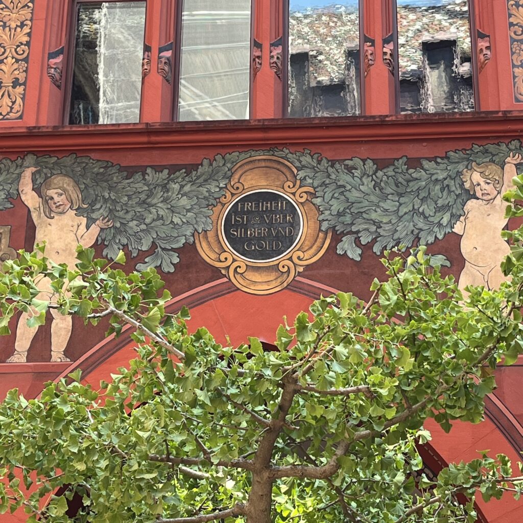 In de middag gaat Mayke werken en ik bezoek het Basler Kunst Museum, enorm groot, na drie uur ben ik wel verzadigd, maar heb ik nog lang niet alles gezien. Wat me vooral opvalt is dat de afdeling moderne kunst na 1950 letterlijk erg kleurloos is, veel grijs en bruin, alsof die Zwitsers door al die grijze rotsen om hen heen de kleuren afgezworen hebben. Ronduit interessant is een kleine tentoonstelling waarbij de achterkanten vn middeleeuwse schilderijen op paneel centraal staan.
