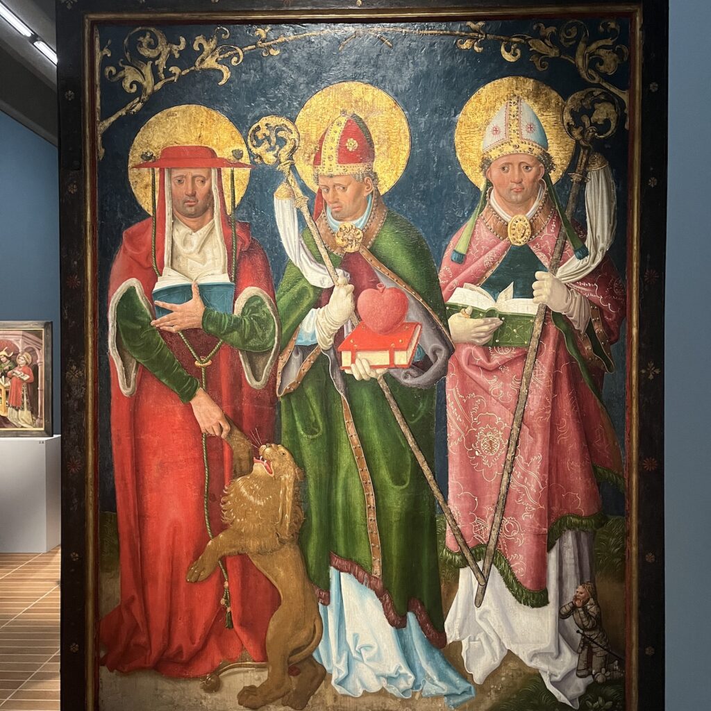 Jeronimus, Augustinus en Hubertus. Aan de hoofddeksels kun je zien dat ze kardinaal, bisschop en paus zijn.