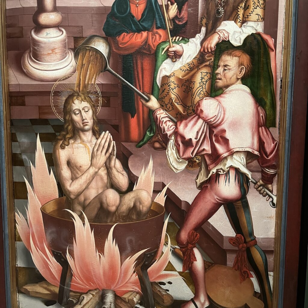 Hier wordt Johannes de Evangelist in de olie gekookt. Let op het bedruipen van het gebraad door een soldaat.