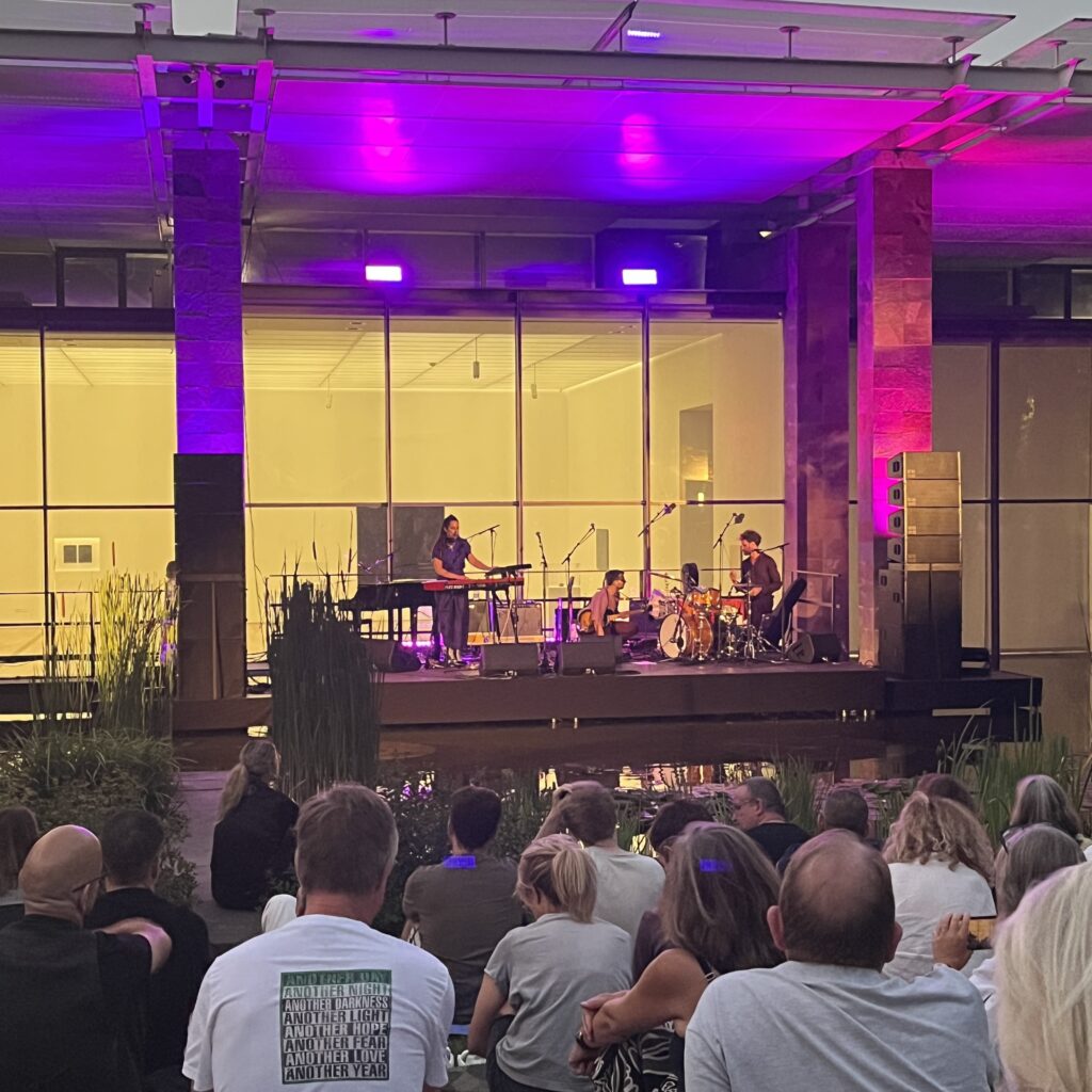 Gisterenavond gingen we voor een laatste keer uit eten, nu in het Landgasthof van Riehen, salade en doradefilet op een bedje van polenta en sorbetijs toe. Tot slot gingen we nog een keer naar de Fondation Beyeler waar ze een open dag hadden die werd afgesloten met een concert van Joan as a policewoman. De band stond opgesteld aan de ene kant van de vijver onder de luifel van het museum en het publiek zat daartegenover op het gras van de heuvel. Helaas sloeg de luifel de muziek nogal dood, waardoor het geheel dof klonk. Maar de sfeer was super, overal mensen op kleedjes met eten en drinken die een leuke avond gingen hebben. En alles was heel goed georganiseerd, inclusief een fietsenparkerplaats met bewaking.